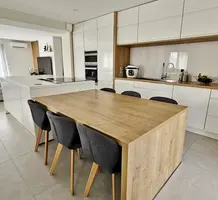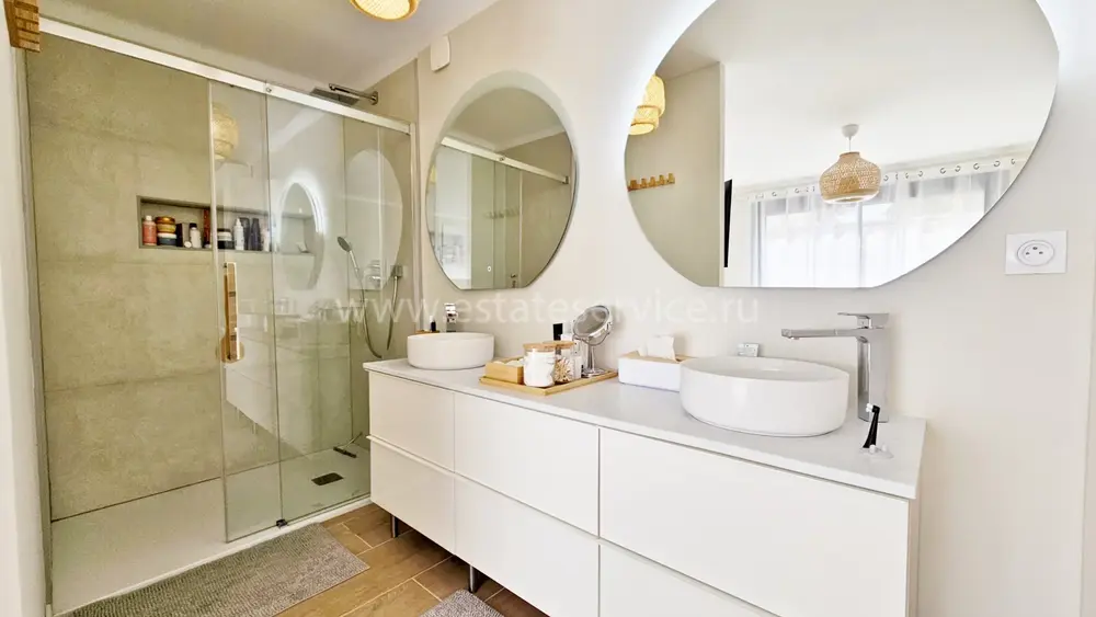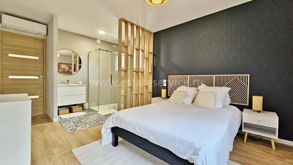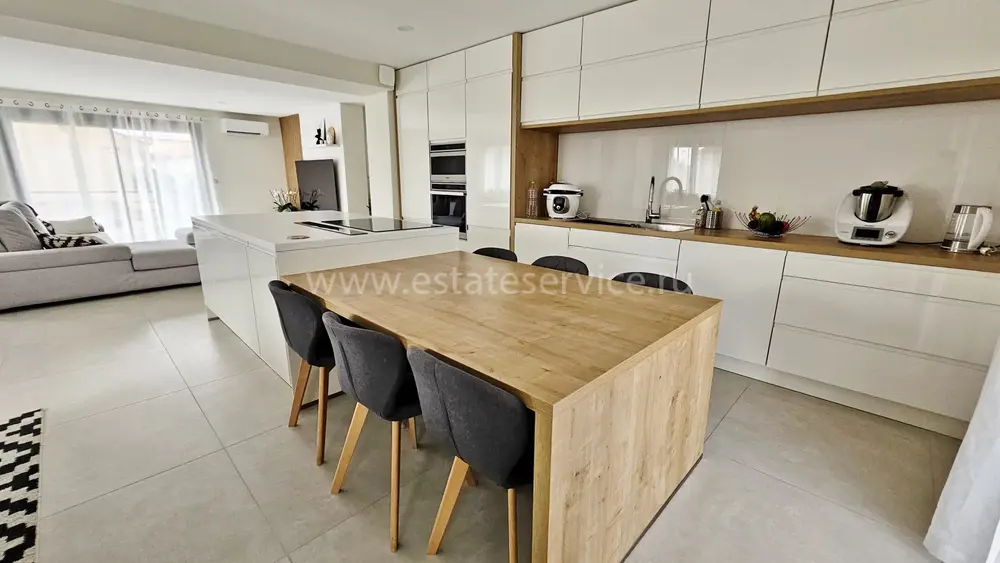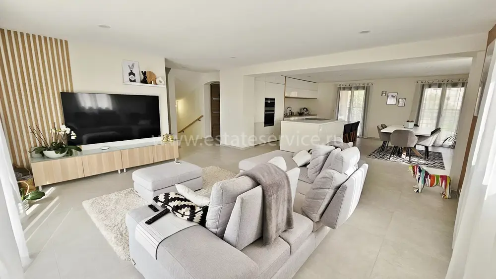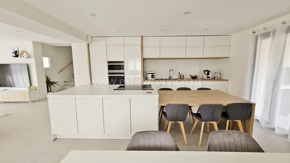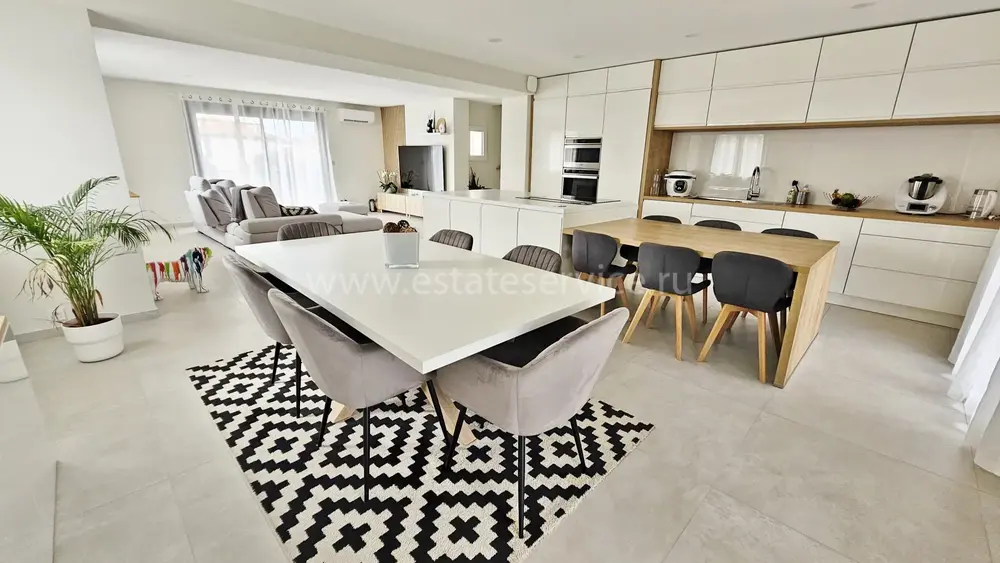 Вилла с роскошной отделкой поблизости от всех удобств (школа, магазины, автобусная остановка) и в 10-ти минутах от моря. Общая площадь 294 m² (жилая 170 m²), на огороженном участке 526 m² разбит аккуратный сад с пальмами, небольшой бассейн и гараж на две машины. На первом этаже разместились прихожая и две спальни, одна из которых люкс со своей кухней, на втором - великолепная гостиная с открытой кухней, обеденной зоной и террасой с барбекю, спальня с душевой комнатой и отдельный туалет. Наверху - ещё две спальни с террасой, ванная комната и туалет. Качественные материалы, функциональный подвал - можно переделать в домашний кинотеатр. Годовой налог 2.800 €.