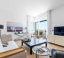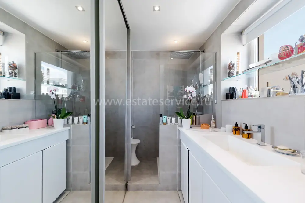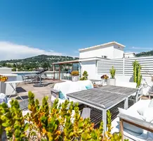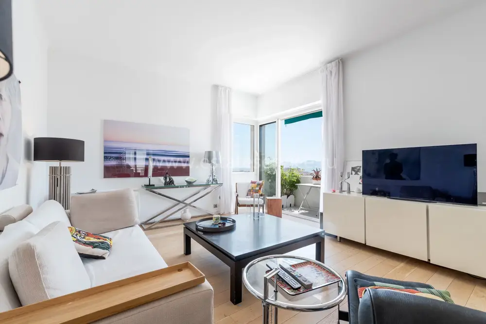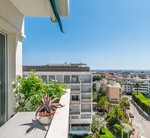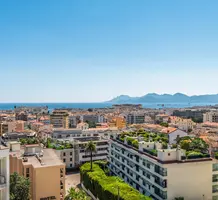 Дуплекс на верхнем (седьмом) этаже здания с лифтом в пешей доступности от центра Канн. Жилая площадь квартиры 93 m² - прихожая, просторная гостиная, открытая кухня, спальня с душевой и гардеробной и отдельный туалет, наверху по лестнице - большая комната свободного назначения - можно использовать под гостевую спальню или кабинет, вторая душевая комната с туалетом, прачечная и большая функциональная терраса с панорамным видом.