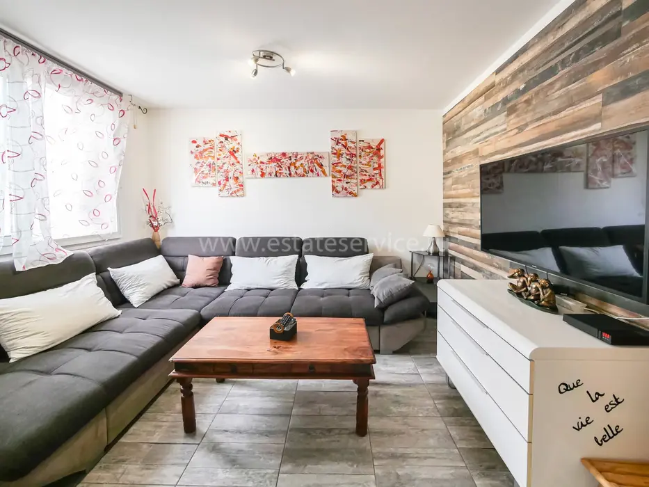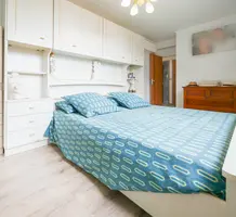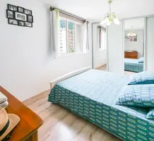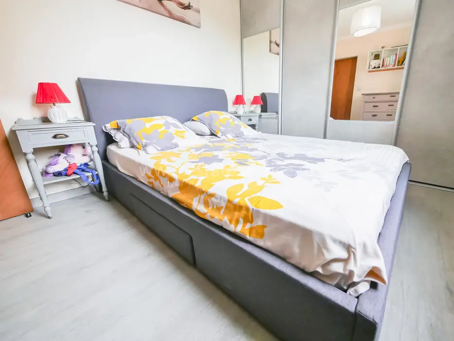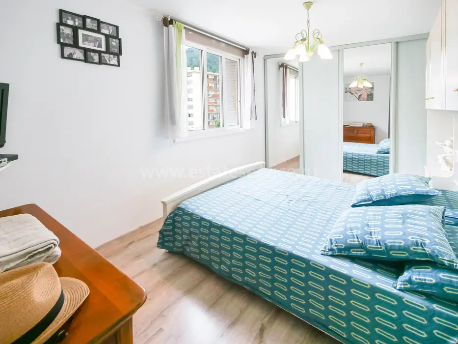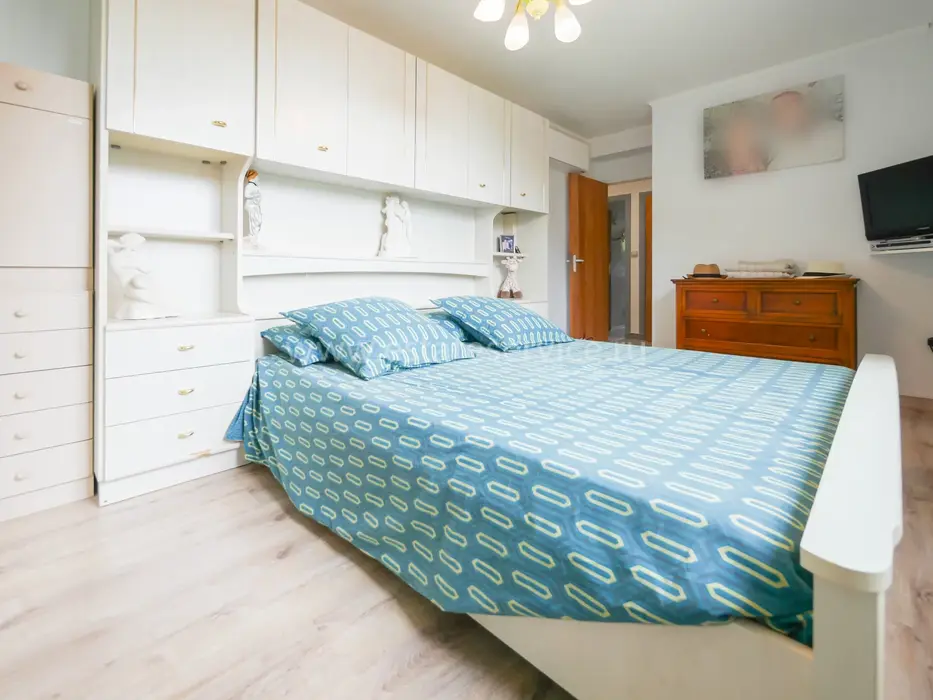 Квартира на четвёртом (4/9) этаже здания с лифтом в 15 минутах от моря. Общая площадь 76.9 m² (жилая 70.6 m²) - прихожая 2.9 m², гостиная 9.2 m², примыкающая столовая с балконом 4.1 m², отдельная кухня 6.7 m² со своим балконом 2.1 m², две спальни 10.7 и 13.2 m², душевая комната и отдельный туалет. Хорошее состояние, включены кладовая и парковочное место. Коммунальные платежи 180 €, годовой налог 1.205 €.