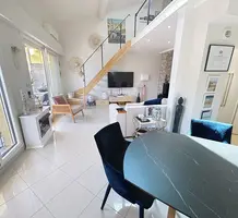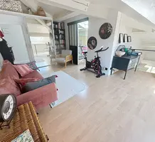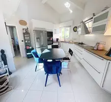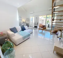 Двухуровневая квартира на верхнем (5-м) этаже здания 2000 года постройки в 900-х метрах от моря. Жилая площадь 91.3 m² - прихожая 4 m², светлая гостиная-столовая 37 m² с высоким потолком, открытой кухней и выходом на панорамную террасу, главная спальня 21 m² со своей душевой и отдельный туалет, наверху по лестнице - открытая гостиная и две спальни 9.4 и 16 m², одна из которых с душем/туалетом. Отличное состояние, в соседнем здании можно арендовать гараж — 110 €/мес. Коммунальные платежи 178 €, годовой налог 1.077 €.