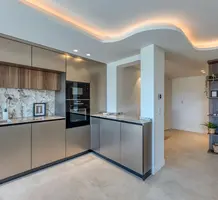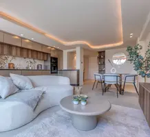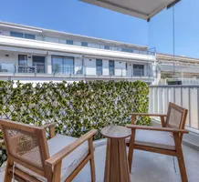 Квартира с новым ремонтом на 4-м (предпоследнем) этаже резиденции с лифтом в минуте ходьбы от моря. Жилая площадь 80 m² - прихожая с встроенными шкафами, светлая гостиная с стильной кухней и открытым видом на зелень, две спальни, одна со своим балконом, две душевые комнаты с подвесными туалетами. Все материалы были тщательно подобраны, центральный кондиционер, парковочное место. Коммунальные платежи 430 €, годовой налог 1.400 €.