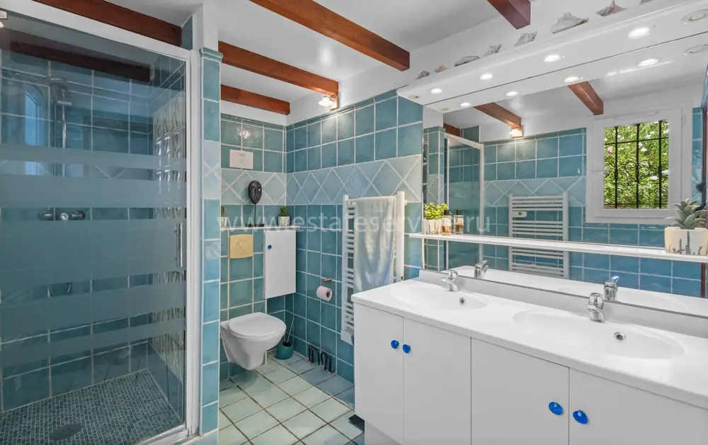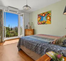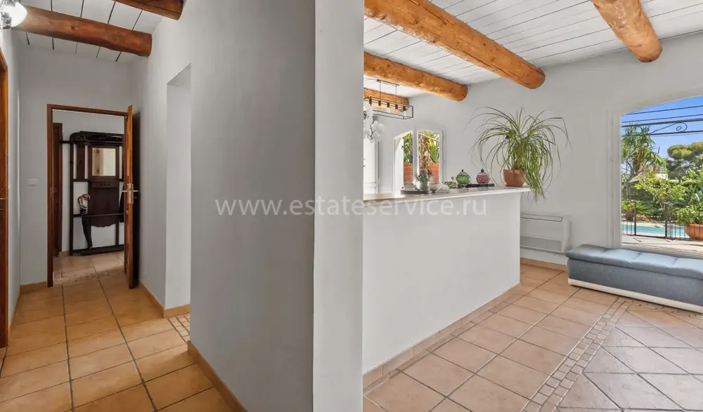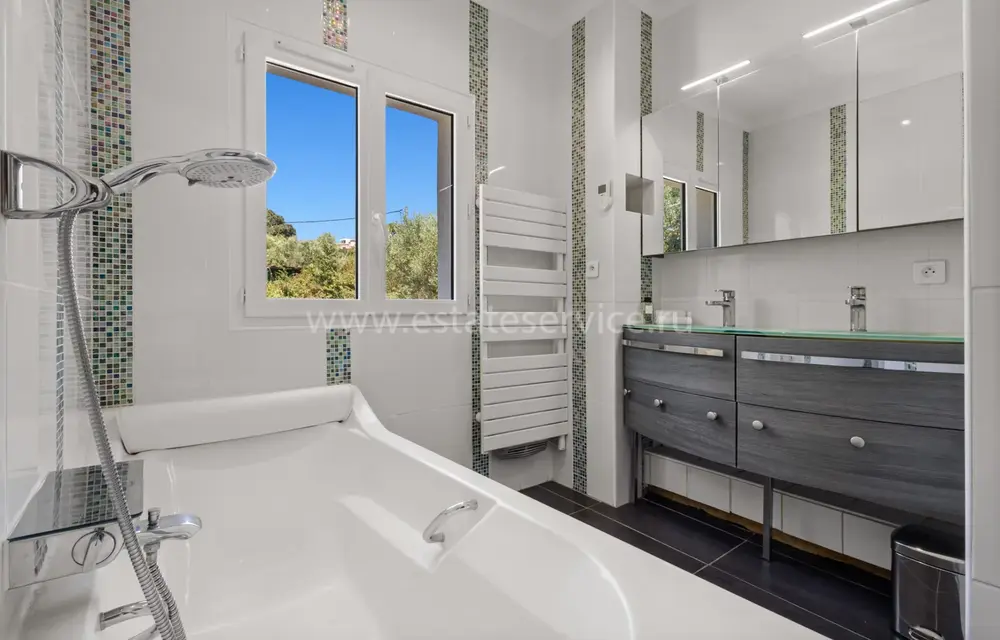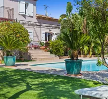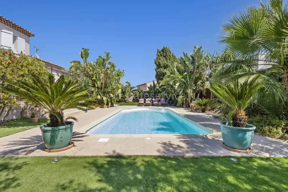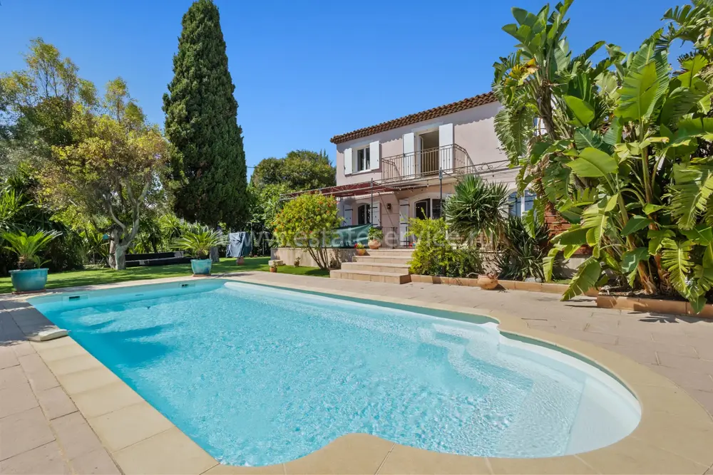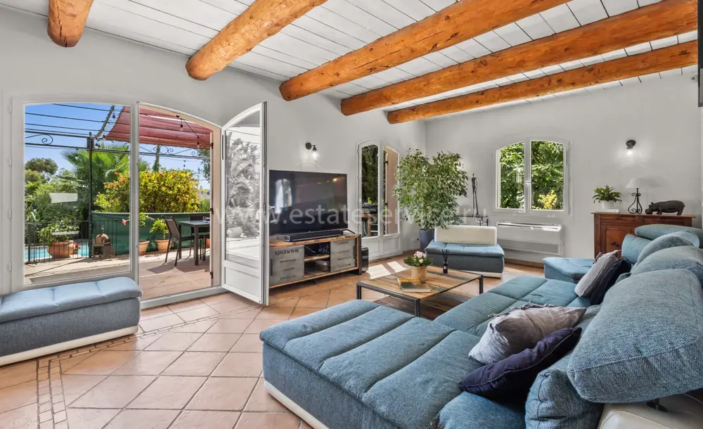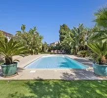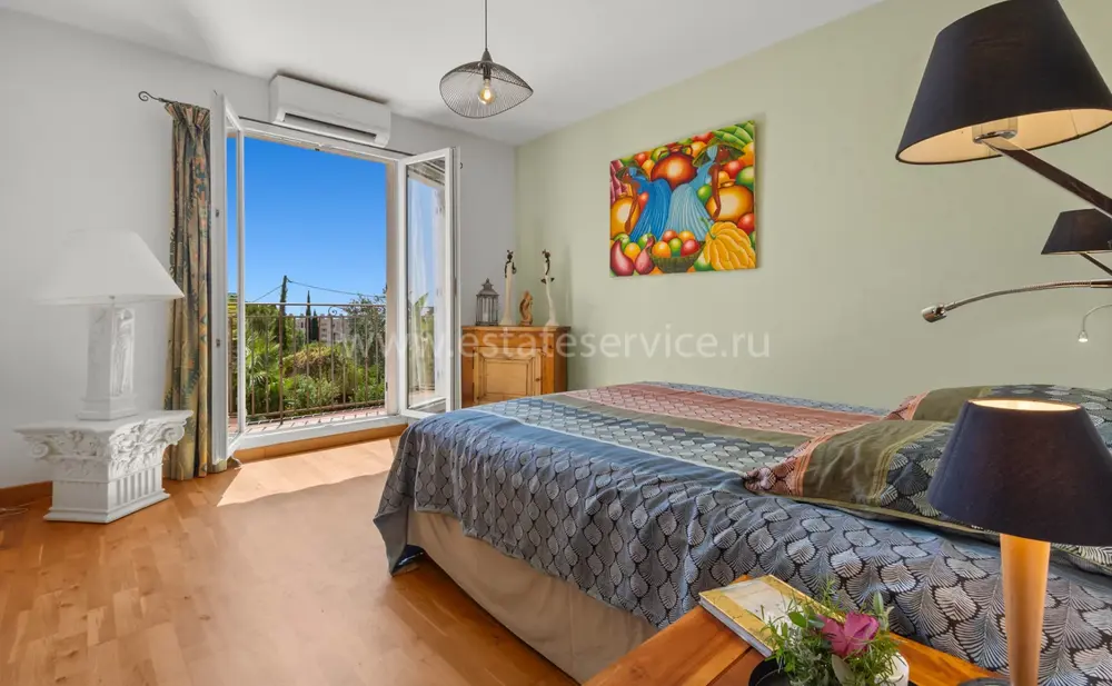 Современный дом (2005 г) провансальской стилистики в квартале Val Fleuri. Жилая площадь 188 m², на ровном участке 1.200 m² с ад с экзотическими растениями и деревьями, большой бассейн, закрытая частная парковка, вмещающая 12-13 автомобилей. На первом этаже прихожая 14.3 m², просторная гостиная 26.8 m² с примыкающей столовой и кухней 14.2 m² выходят на террасу 80 m², гостевой туалет и прачечная. Коридор с отдельным входом ведет в студию 31 m² с мини-кухней, душевой/туалетом и спальней в антресоли - удачный вариант для приема гостей или сдачи в аренду. На втором этаже пять спален 9.8, 12, 13.6, 13.7 и 14 m², главная имеет балкон с видом на море, общая ванная комната и отдельный туалет. Удобное расположение на тихой тупиковой улице недалеко от моря и ресторанов. Годовой налог 3.032 €.