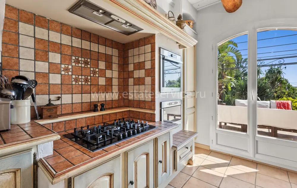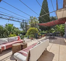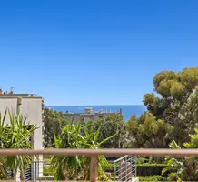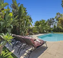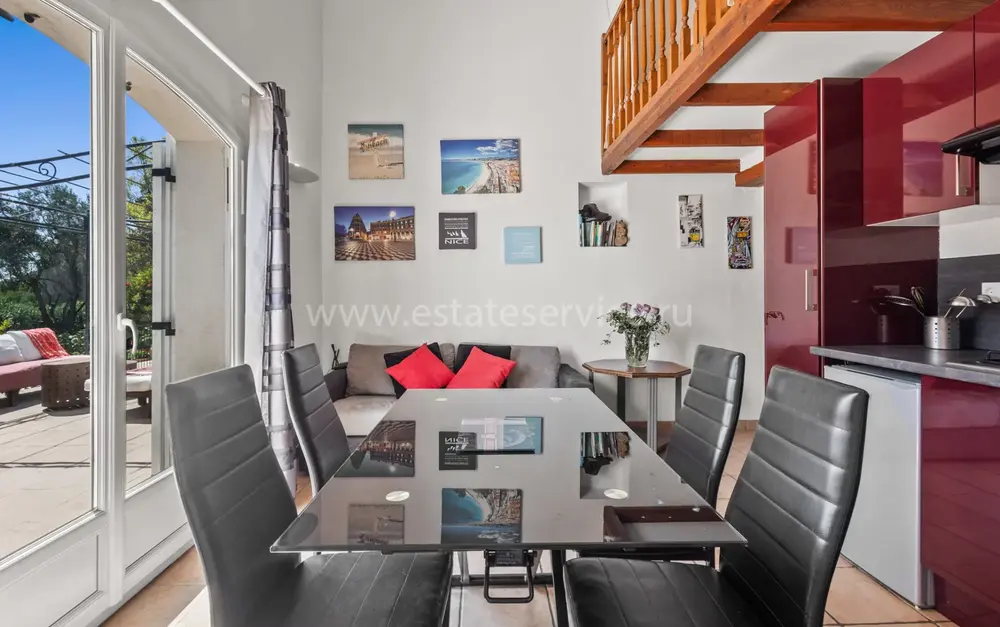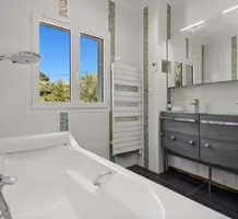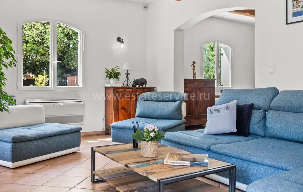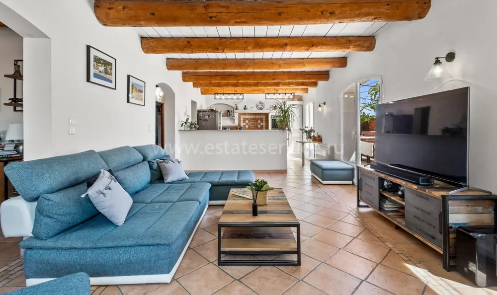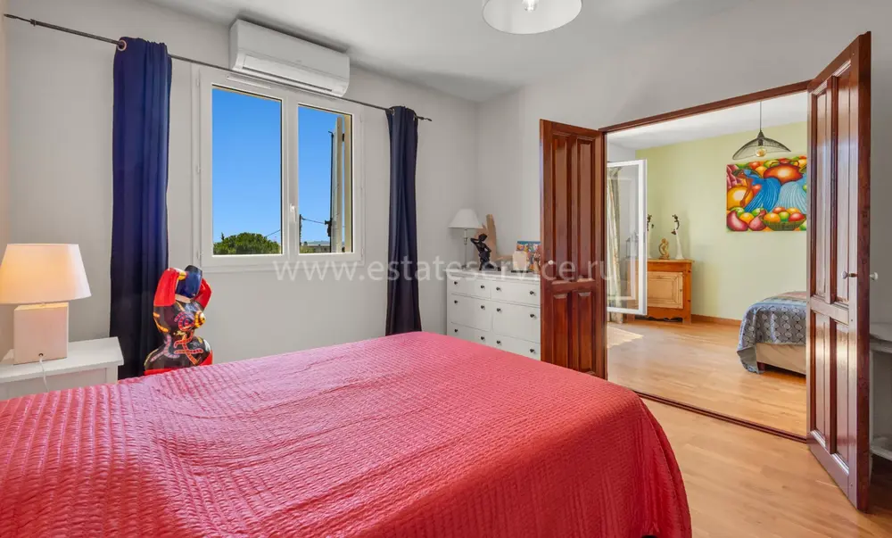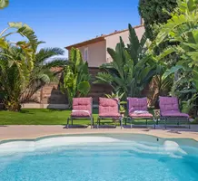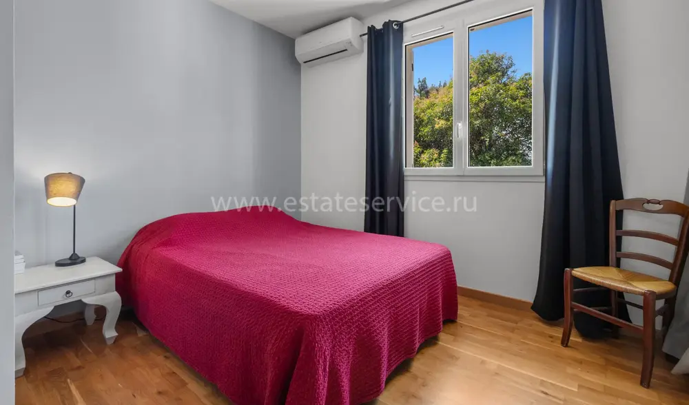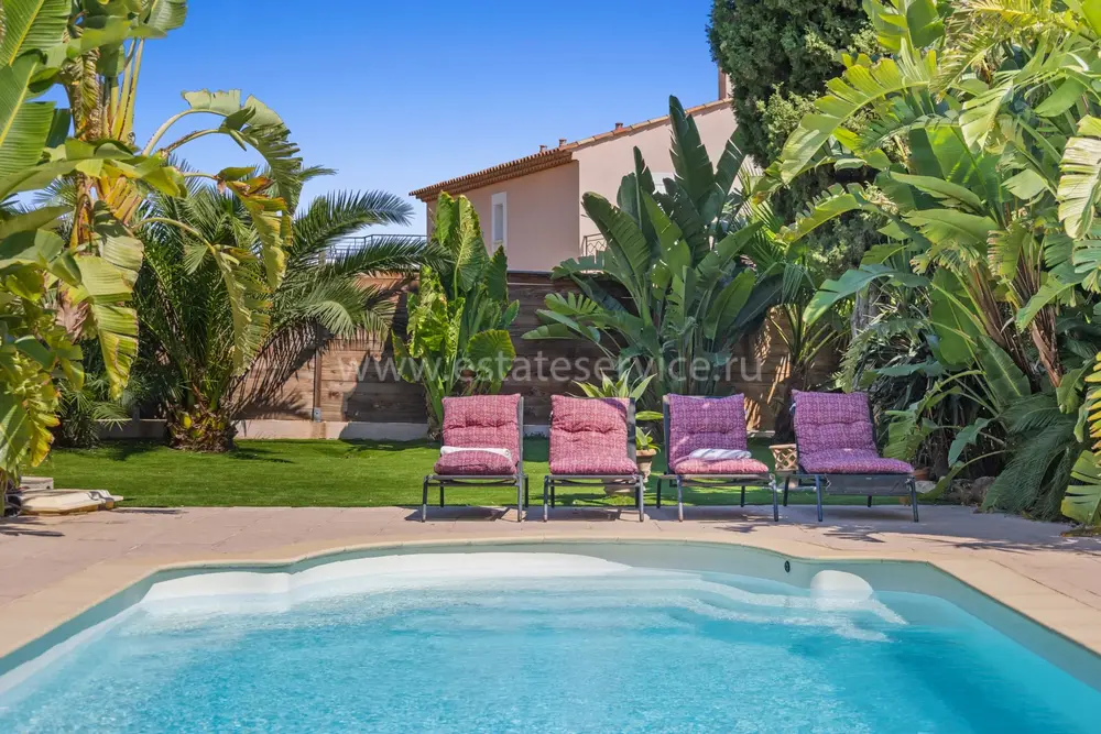 Современный дом (2005 г) провансальской стилистики в квартале Val Fleuri. Жилая площадь 188 m², на ровном участке 1.200 m² с ад с экзотическими растениями и деревьями, большой бассейн, закрытая частная парковка, вмещающая 12-13 автомобилей. На первом этаже прихожая 14.3 m², просторная гостиная 26.8 m² с примыкающей столовой и кухней 14.2 m² выходят на террасу 80 m², гостевой туалет и прачечная. Коридор с отдельным входом ведет в студию 31 m² с мини-кухней, душевой/туалетом и спальней в антресоли - удачный вариант для приема гостей или сдачи в аренду. На втором этаже пять спален 9.8, 12, 13.6, 13.7 и 14 m², главная имеет балкон с видом на море, общая ванная комната и отдельный туалет. Удобное расположение на тихой тупиковой улице недалеко от моря и ресторанов. Годовой налог 3.032 €.