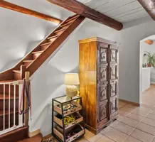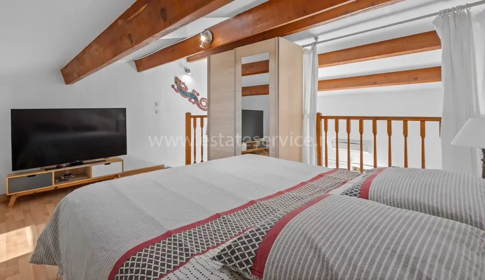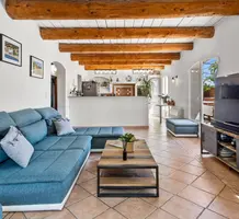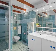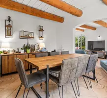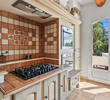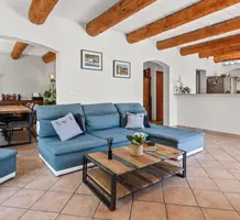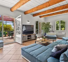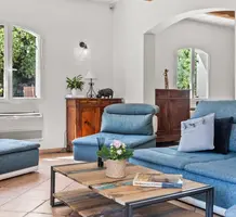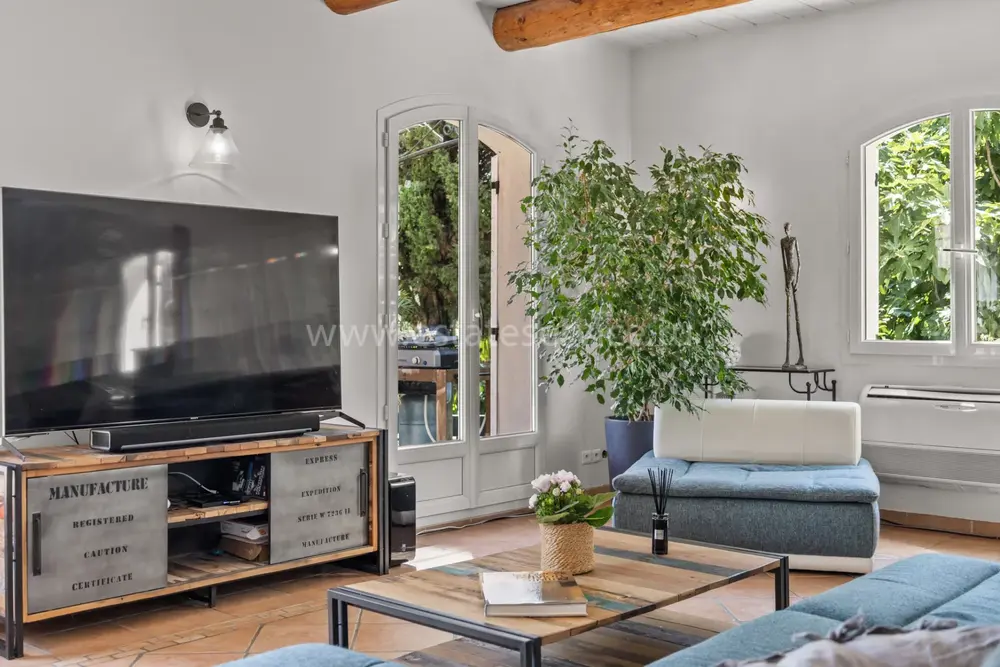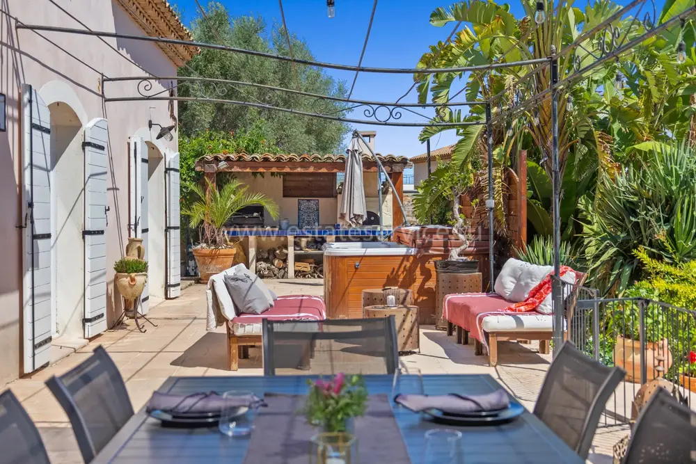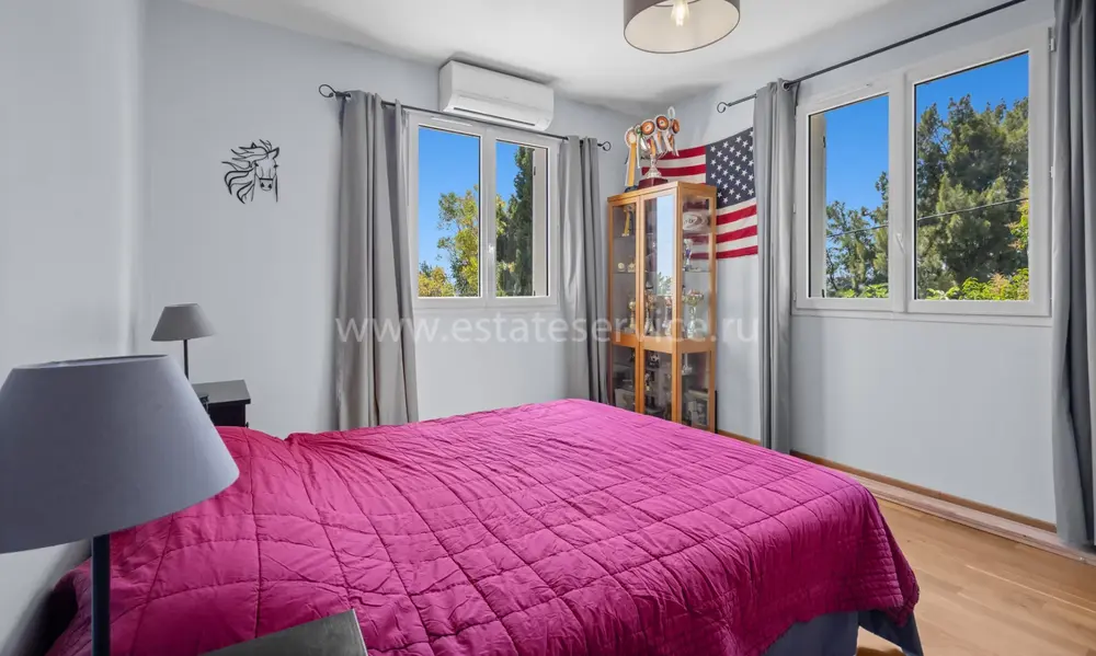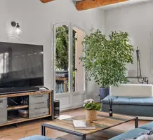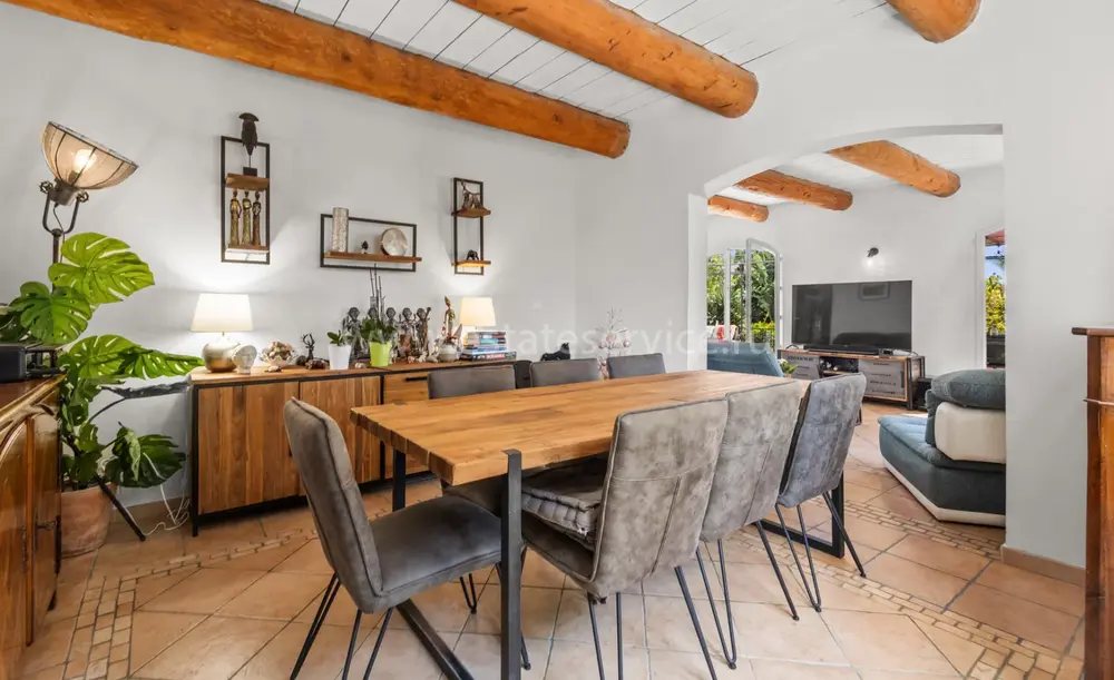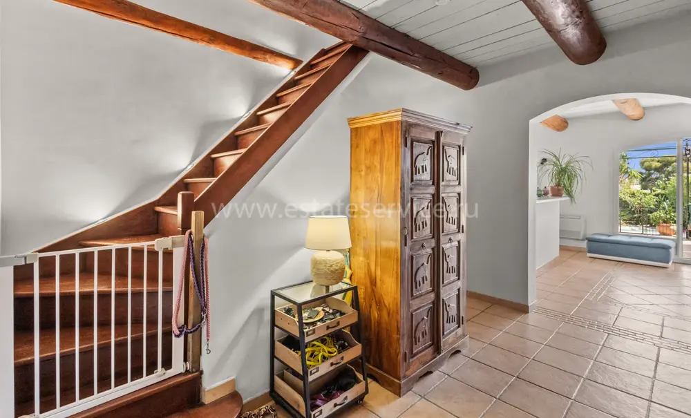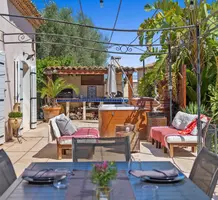 Современный дом (2005 г) провансальской стилистики в квартале Val Fleuri. Жилая площадь 188 m², на ровном участке 1.200 m² с ад с экзотическими растениями и деревьями, большой бассейн, закрытая частная парковка, вмещающая 12-13 автомобилей. На первом этаже прихожая 14.3 m², просторная гостиная 26.8 m² с примыкающей столовой и кухней 14.2 m² выходят на террасу 80 m², гостевой туалет и прачечная. Коридор с отдельным входом ведет в студию 31 m² с мини-кухней, душевой/туалетом и спальней в антресоли - удачный вариант для приема гостей или сдачи в аренду. На втором этаже пять спален 9.8, 12, 13.6, 13.7 и 14 m², главная имеет балкон с видом на море, общая ванная комната и отдельный туалет. Удобное расположение на тихой тупиковой улице недалеко от моря и ресторанов. Годовой налог 3.032 €.