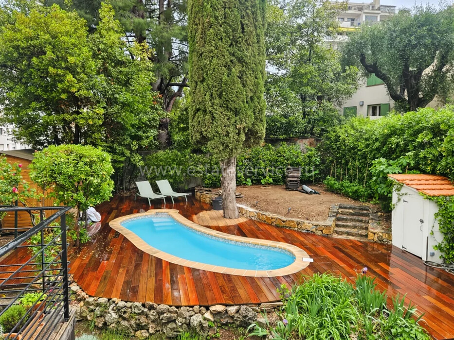 Полностью отремонтированная элегантная вилла в пешей доступности от центра Канн. Жилая площадь дома 124.6 m², на участке 520 m² разбит аккуратный сад, бассейн, сарай. На первом этаже просторная гостиная с большими окнами и выходом на террасу, современная кухня, спальня с отдельным входом и ванная комната с душевой кабиной и туалетом. Наверху разместились ещё две спальни (главная с гардеробной изготовленной на заказ),изысканная общая ванная комната с туалетом и отдельный санузел. Годовой налог 1.627 €.