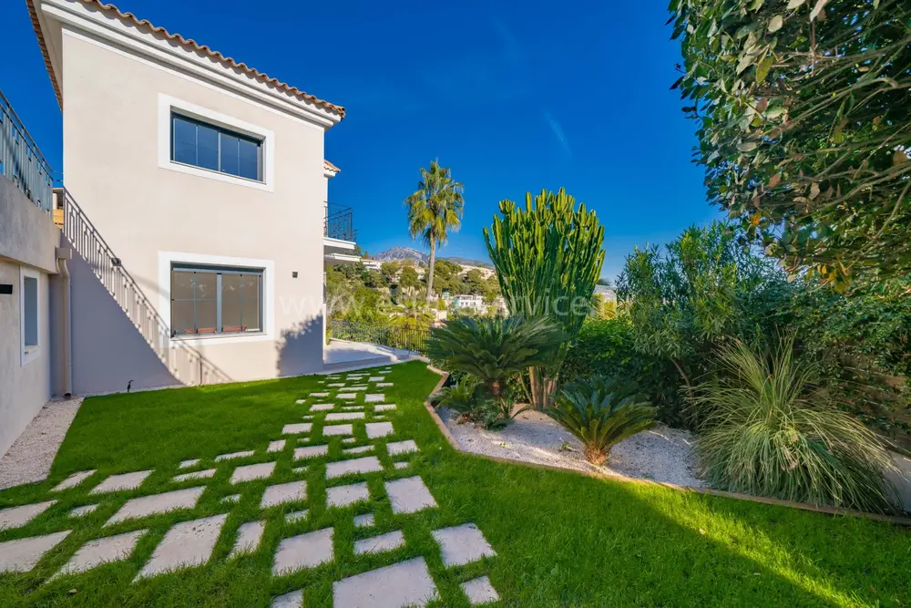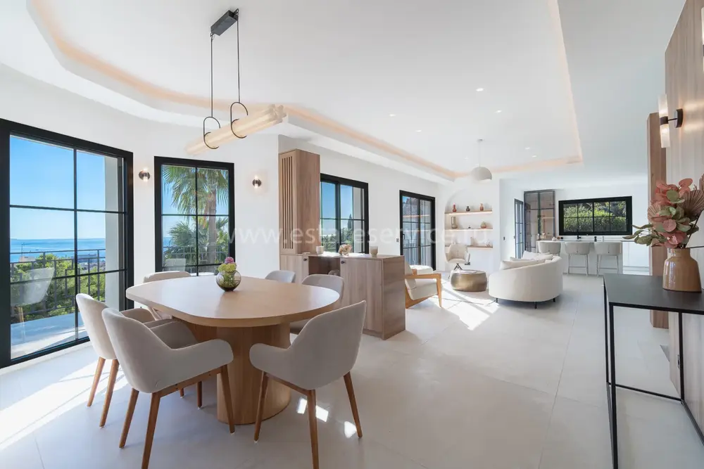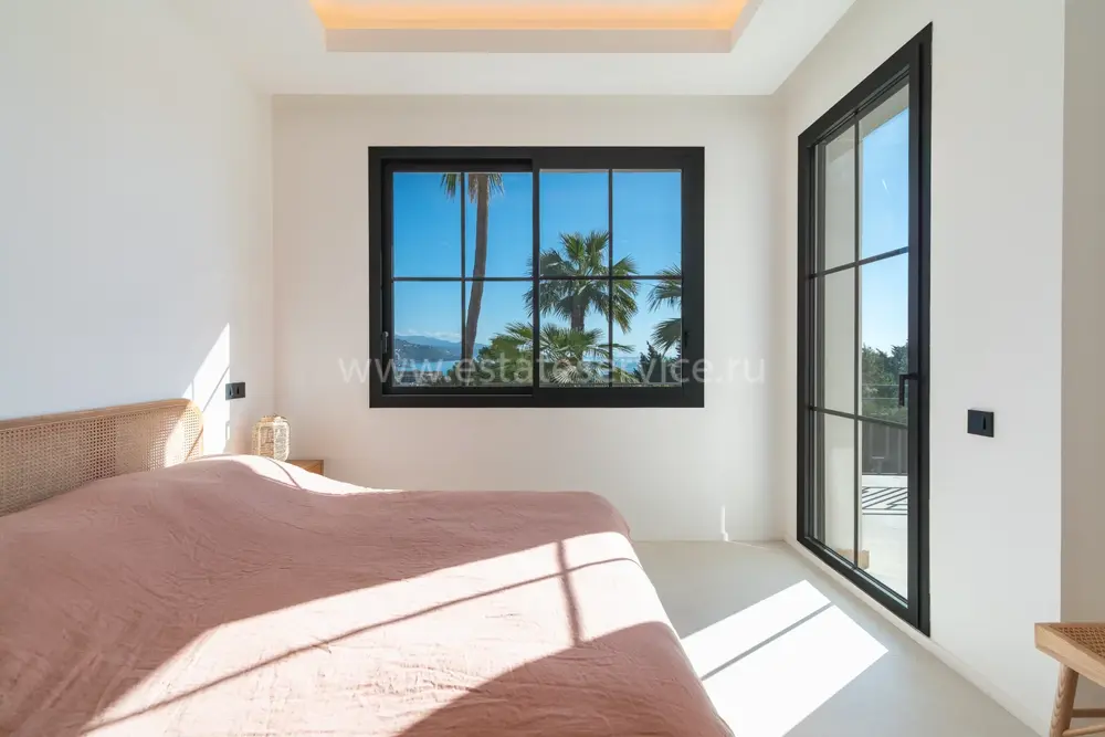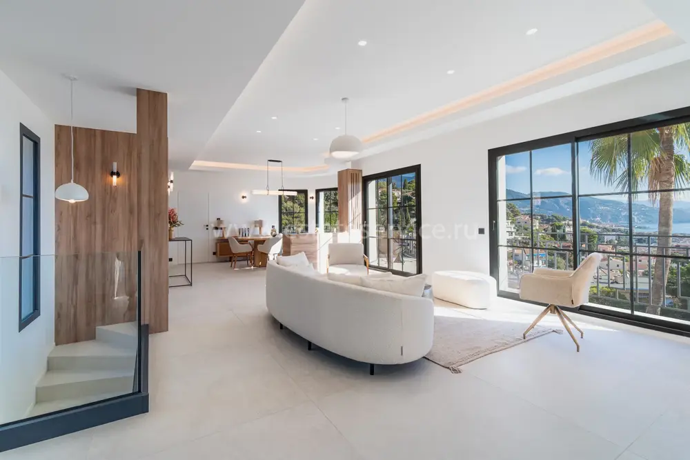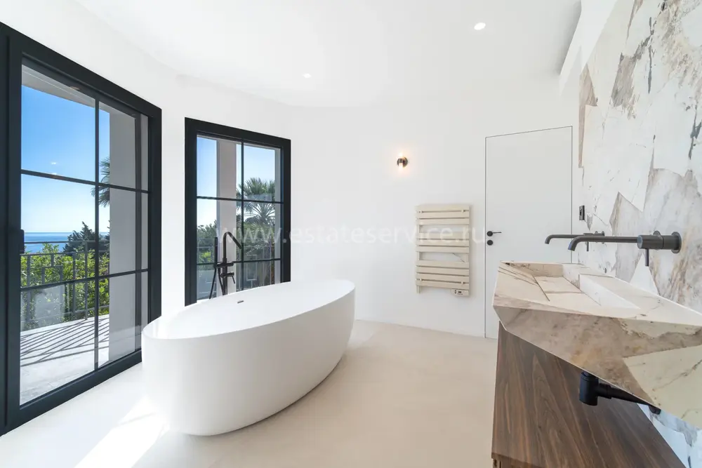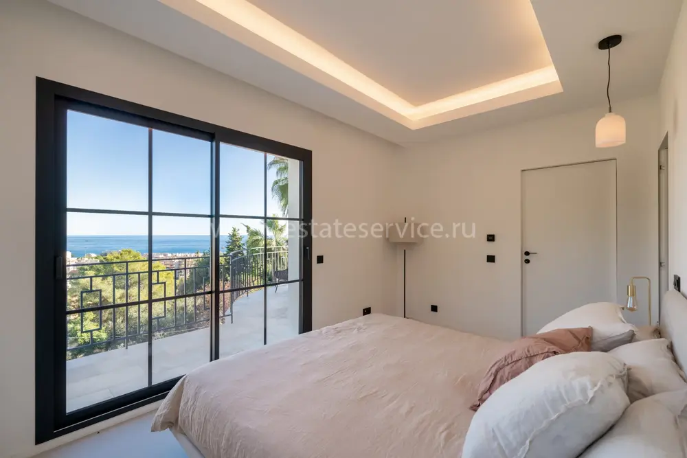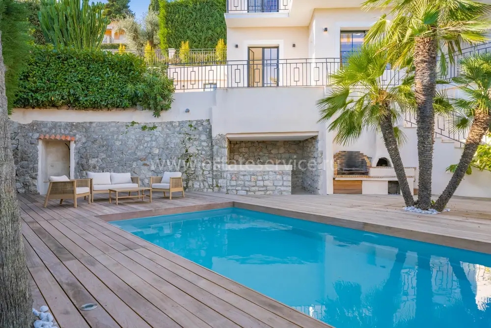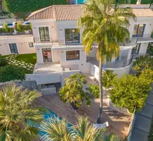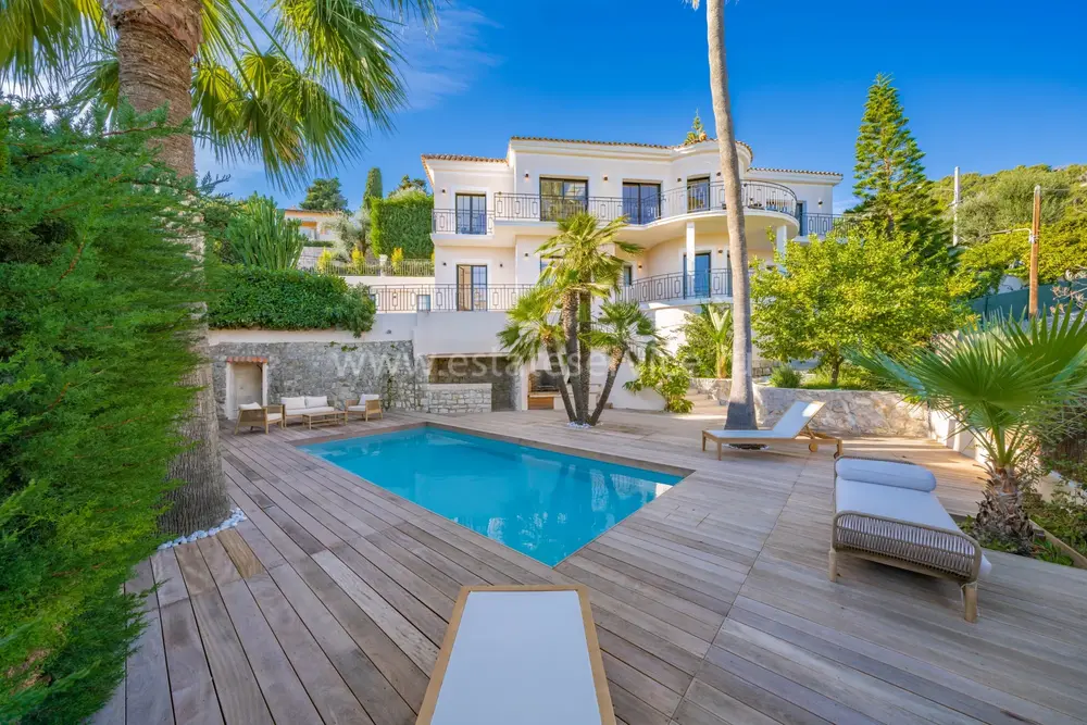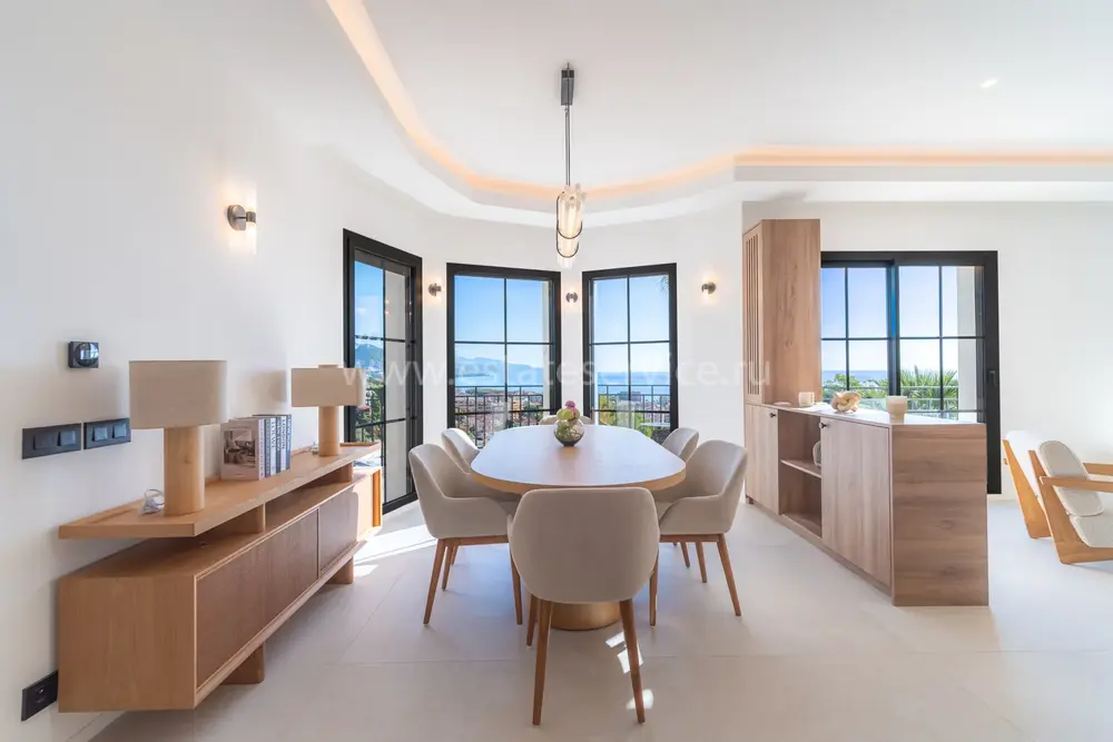 Стильная вилла с качественной изысканной отделкой и панорамным видом на море, горы и окрестности - престижный сектор Hameau. Площадь дома 238 m² - светлая и просторная гостиная-столовая с примыкающей кухней, четыре спальни с ванными/душевыми комнатами, отдельная гостевая студия, просторный гараж и террасы. На участке 803 m² ухоженный сад, много экзотических насаждений, домик у бассейна, летняя кухня и душевая. Годовой налог на имущество 1.800 €.