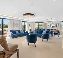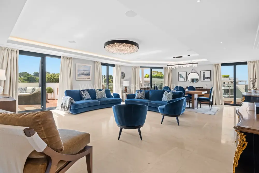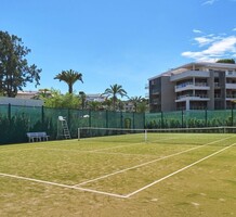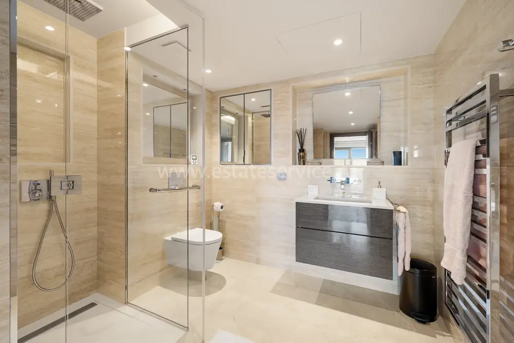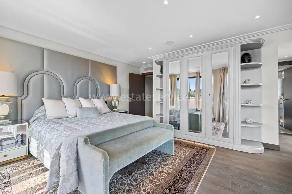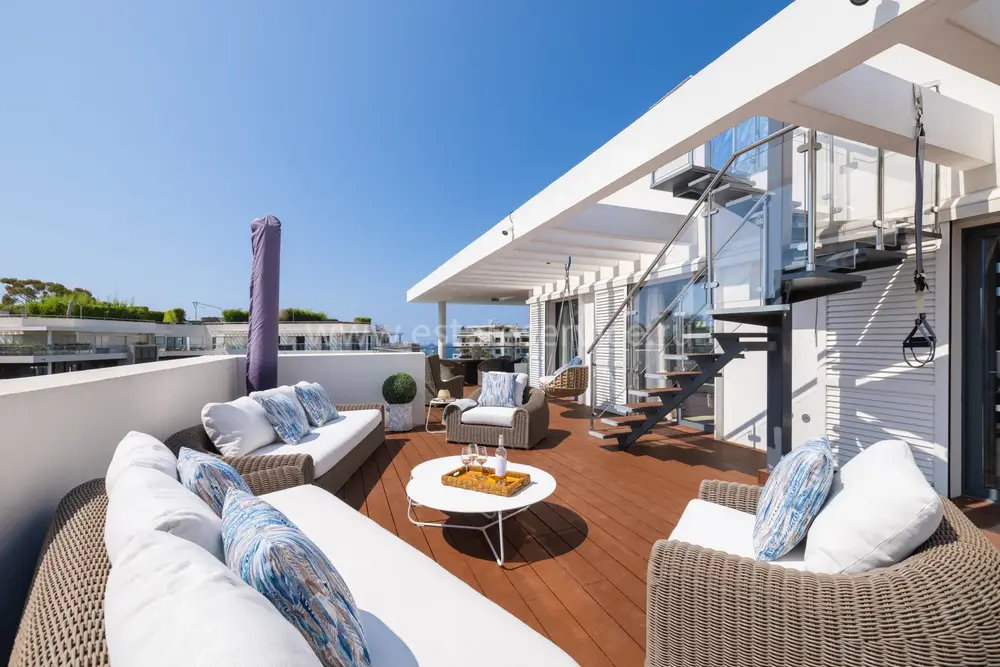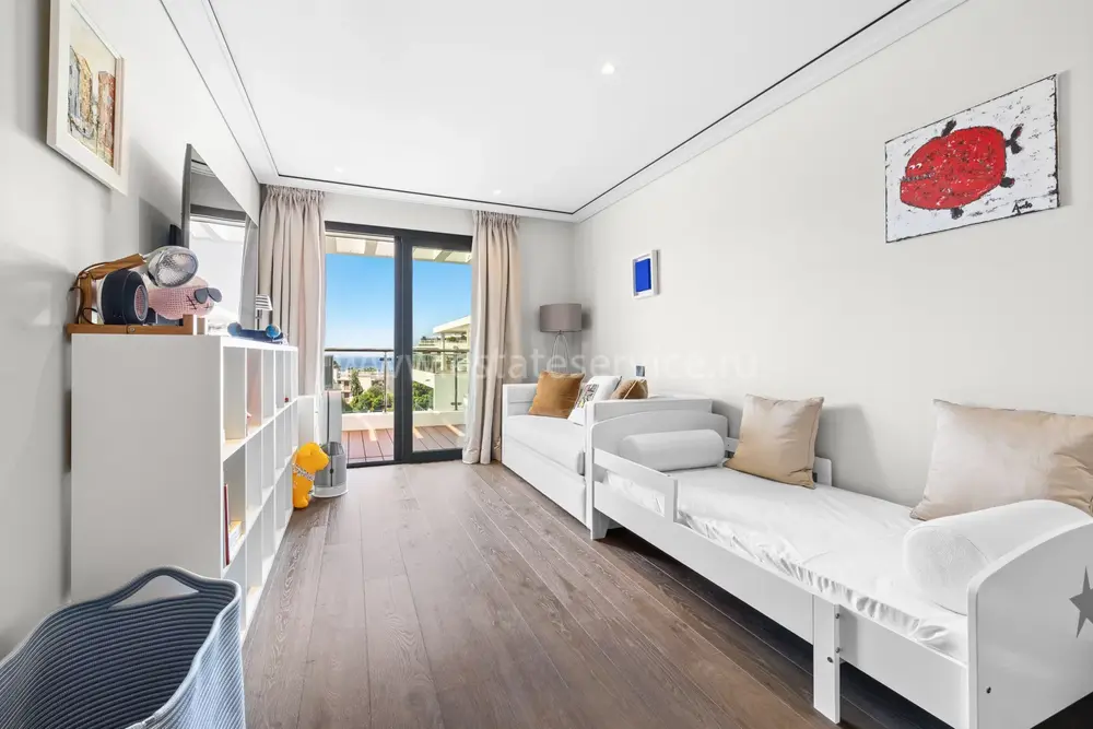 Квартира на верхнем этаже современной закрытой резиденции с бассейнами, СПА зоной, тренажерным залом, теннисным кортом и ландшафтным садом в 300-х метрах от моря. Жилая площадь 182 m² - прихожая с гостевым туалетом, гостиная 52 m² с примыкающей кухней 11.4 m², четыре спальни 11.7, 15, 18 и 20 m² со своими ванными/душевыми и туалетами, а также просторные террасы 162 и 173 m² с частным бассейном на крыше. Коммунальные платежи 8.400 € за квартал.