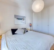 Тихая квартира на верхнем этаже здания с лифтом в трёх минутах ходьбы от пляжа и центра. Общая площадь 75.7 m² (жилая 63.1 m²) - прихожая 13 m², светлая гостиная 21.9 m² с открытой кухней и солнечной лоджией 12.6 m² - есть проблеск моря, две спальни 11 и 11.2 m², ванная комната и отдельный туалет. Отличное состояние, есть кладовая, всё пешком. Коммунальные платежи 225 €.