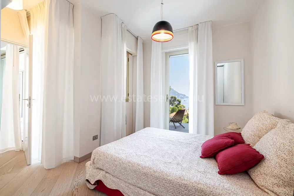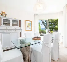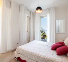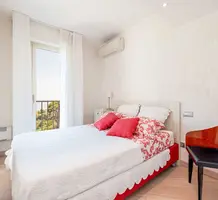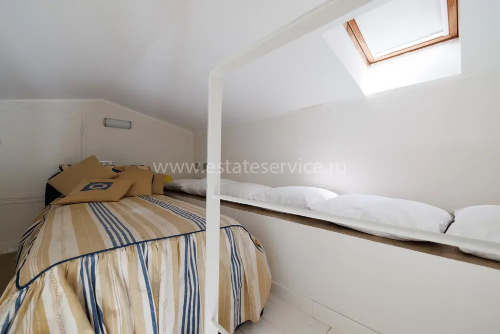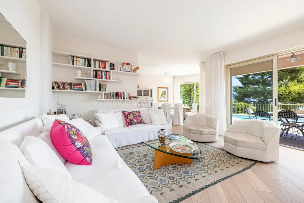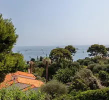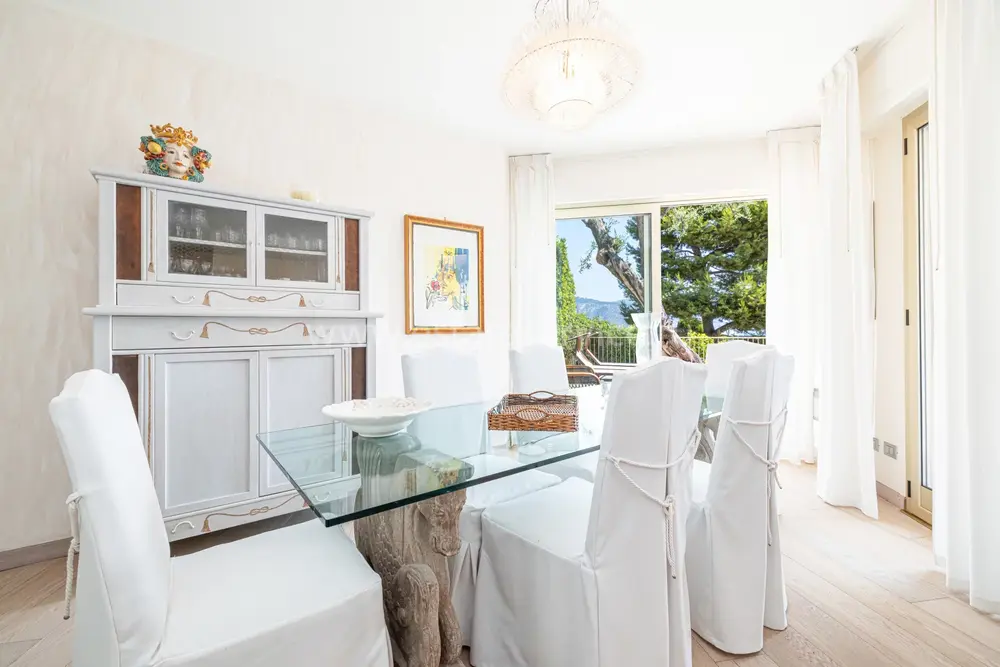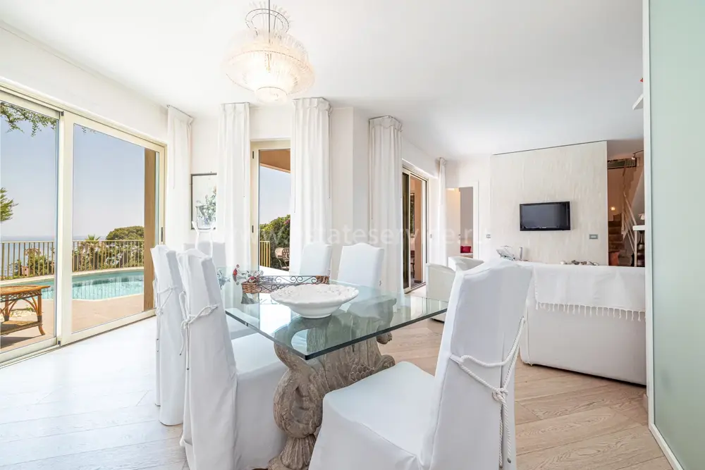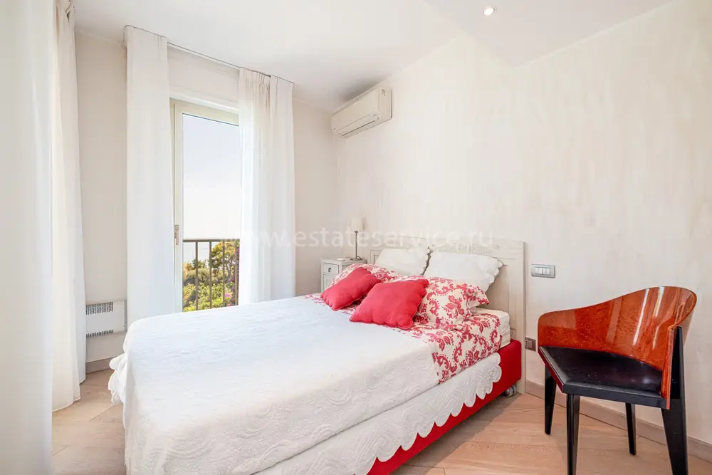 Смежная вилла в закрытой резиденции с консьержем в пешей доступности от моря. Жилая площадь 119 m², на первом уровне - прихожая, просторная гостиная с выходом на большую террасу с садом и частным бассейном, отдельная кухня и спальня с ванной комнатой. На втором разместились три спальни, одна из которых выходит на террасу, две ванные комнаты и пятая небольшая спальня наверху в мезонине. Приятный вид на море и Италию, есть два гаража и две кладовые. Коммунальные платежи 650 €, годовой налог 3.046 €.