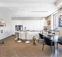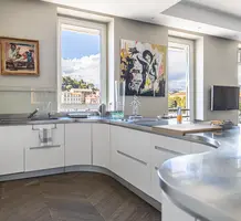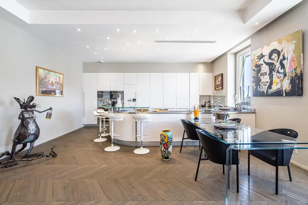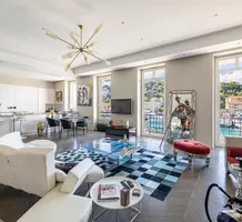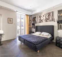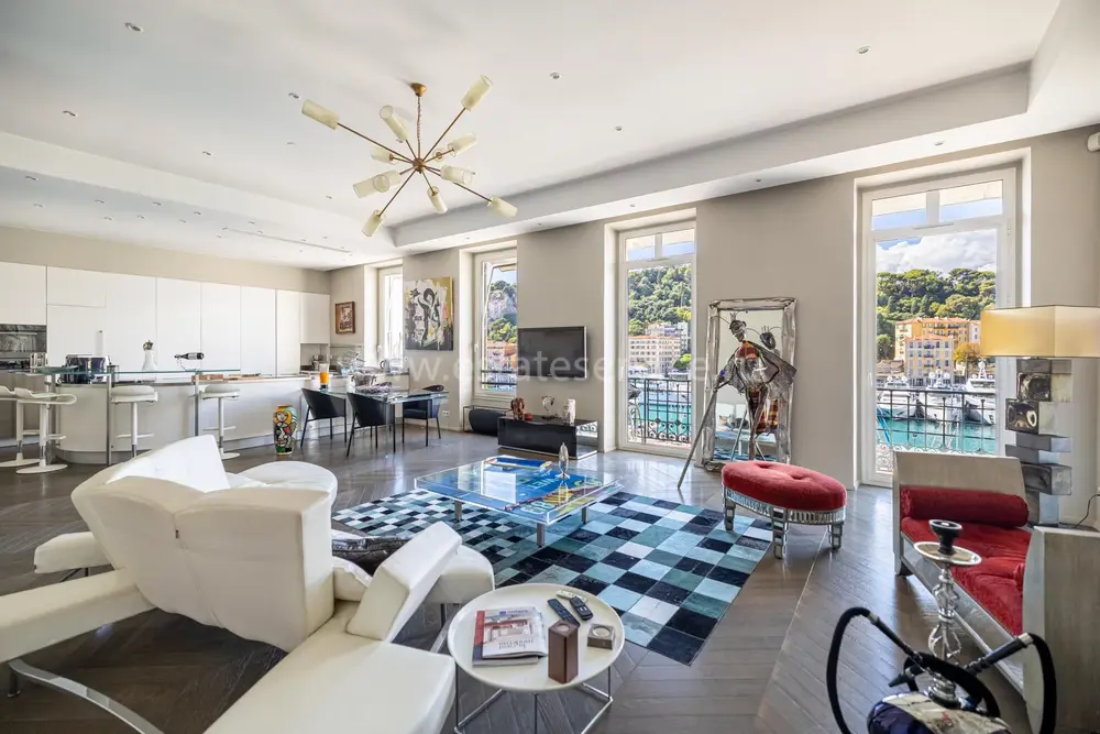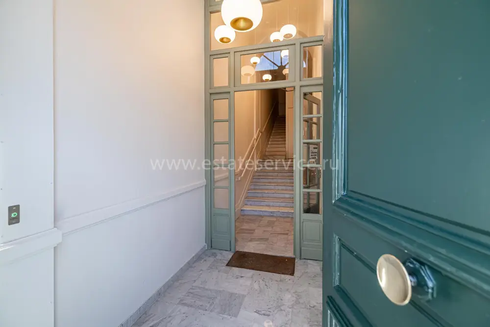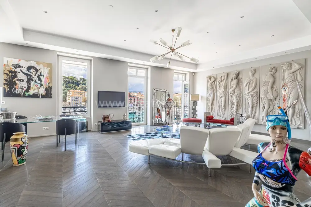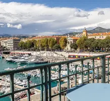 Апартаменты на 4-м (предпоследнем) этаже недавно отреставрированного здания Belle Époque с лифтом. Общая площадь квартиры 118.3 m² (жилая 116 m²) - прихожая 11.8 m² с гардеробной, светлая и просторная гостиная 67.2 m² с открытой кухней и большим балконом 4.5 m² - вид на море, Port Lympia и Кап-д'Антиб, тихая и просторная спальня 27.4 m² с балконом 2 m², гардеробной и душевой/туалетом, вторая душевая с туалетом. Шикарная отделка, высота потолков более трёх метров, пешая доступность всех удобств. Коммунальные платежи 166 €, годовой налог 1.386 €.