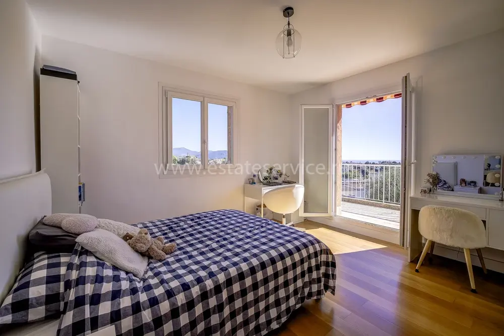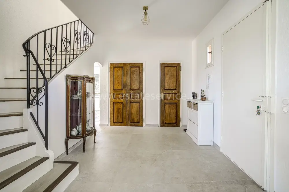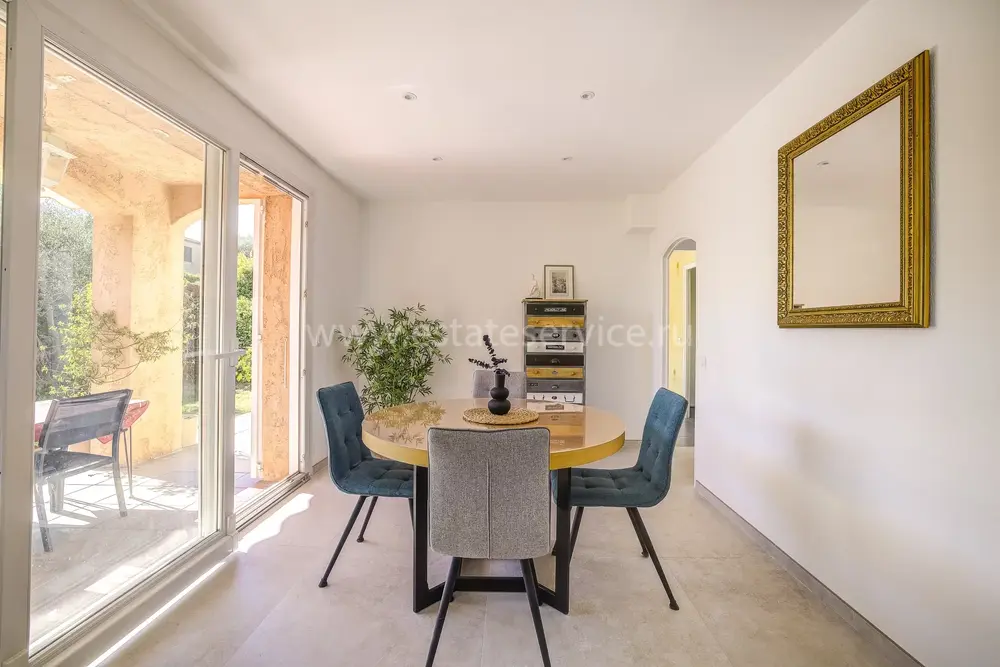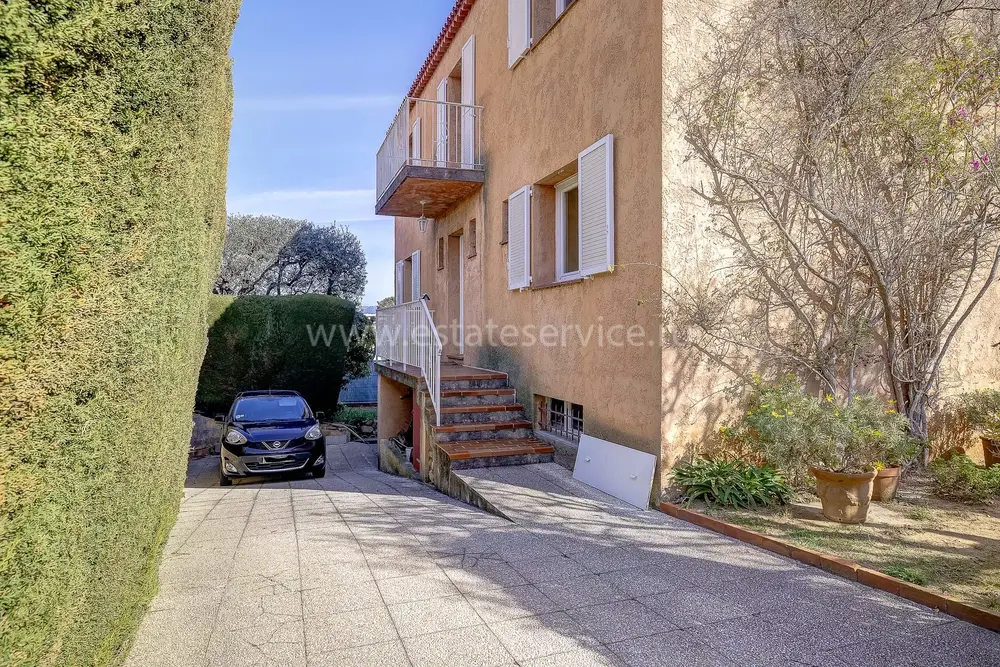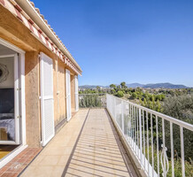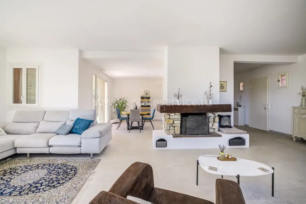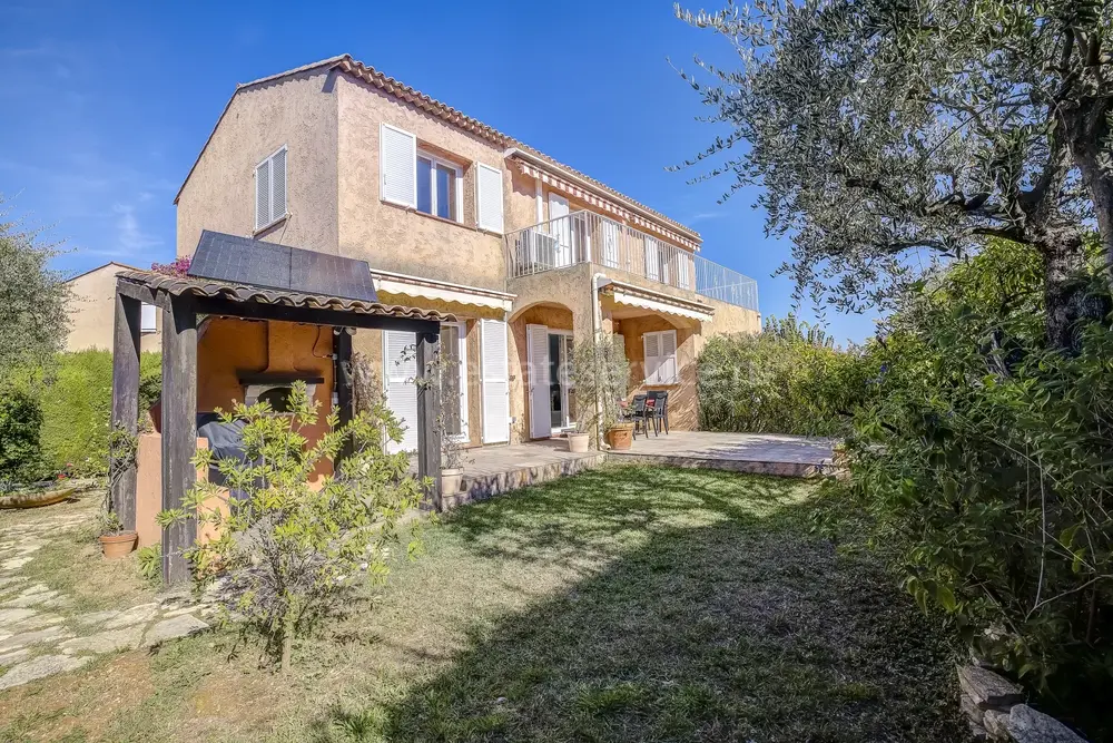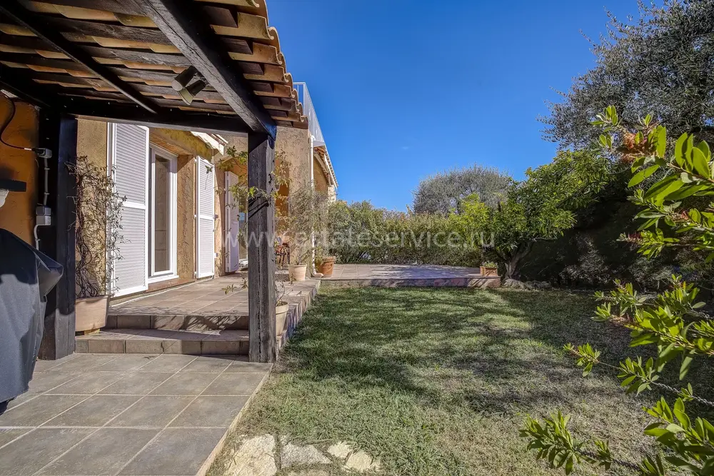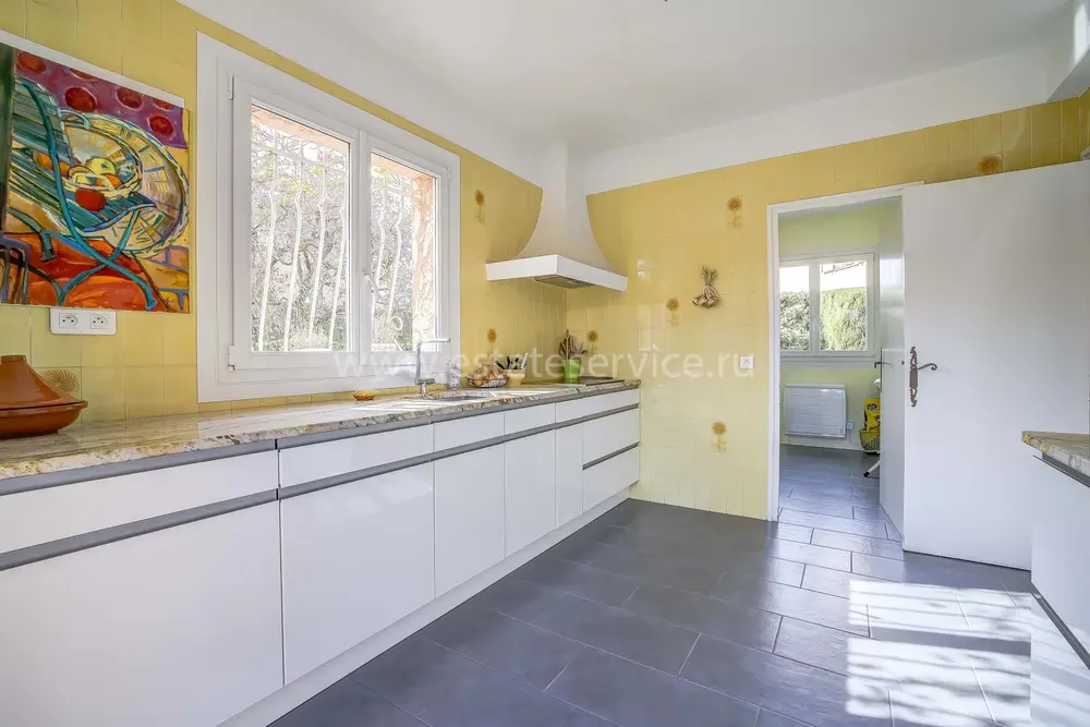 Обновлённая вилла в безопасной закрытой резиденции с консьержем, бассейном и теннисным кортом поблизости от школы, автобусной остановки и магазинов. Площадь дома 180 m² - прихожая 11.3 m², светлая и просторная гостиная 37 m² с камином, столовая 12.7 m², новая отдельная кухня 11.8 m² с подсобным помещением и туалет. Наверху разместились четыре спальни 10.6, 13.6, 15.6 и 16.3 m², одна с террасой - вид на холмы и море, главная - с ванной комнатой и туалетом, кабинет 11 m² (можно использовать как спальню) и общая ванная комната с туалетом. Есть также пристройка (спальня с душевой и туалетом) и большой гараж/подвал 65 m². На ровном участке 550 m² много фруктовых деревьев, печь для пиццы, паркинг на 3 автомобиля и гостевое парковочное место. Отменное состояние, двойное остекление, новые жалюзи, кондиционер, электрический конвекторный обогреватель, наружное освещение. Коммунальные платежи 132 €, годовой налог 3.131 €.