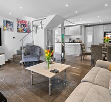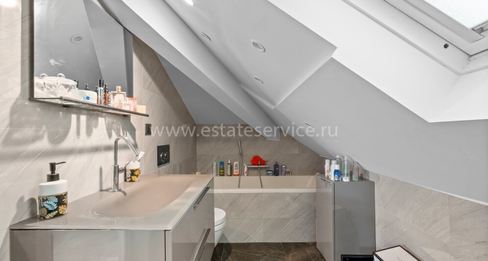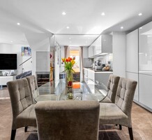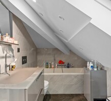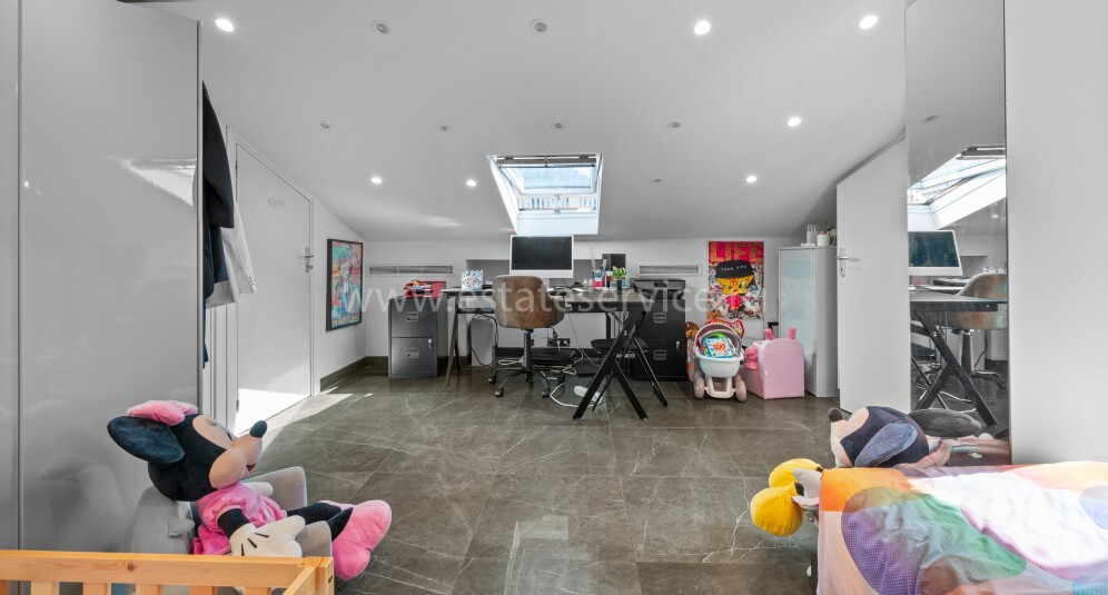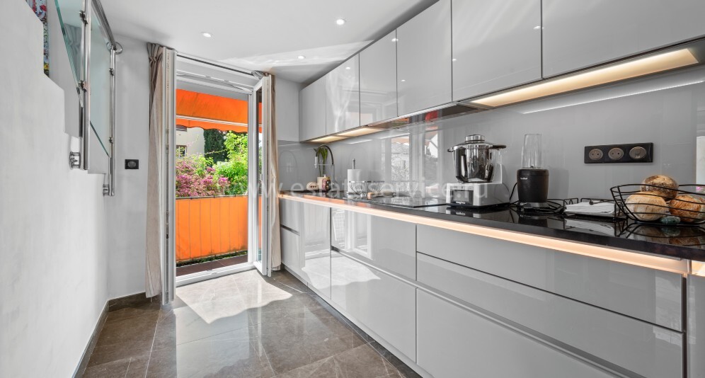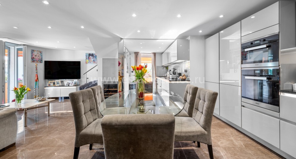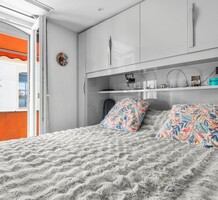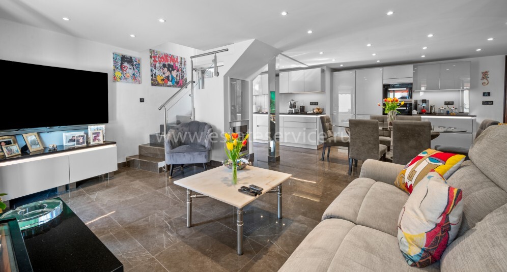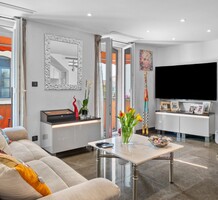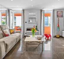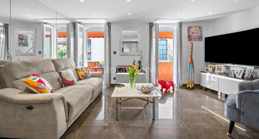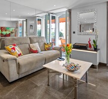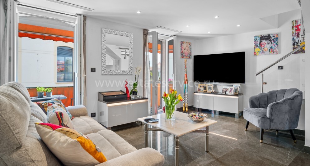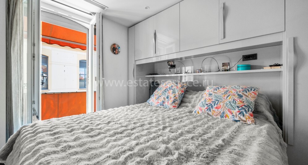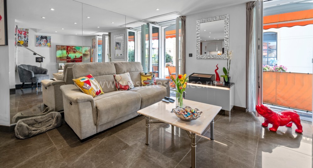 Двухуровневая квартира на верхнем (2-м) этаже небольшого здания в 300-х метрах от моря. Общая площадь 86 m² (жилая 61 m²) - просторная гостиная с открытой кухней и главная спальня (со своей душевой/туалетом) выходят на угловую террасу 14.8 m², наверху в мезонине - детская спальня/кабинет с ванной комнатой и прачечная. Отличное состояние, подогрев полов, реверсивные кондиционеры в каждой комнате, можно купить гараж в соседнем здании - 60.000 €. Коммунальные платежи 115 €, годовой налог 1.144 €.
