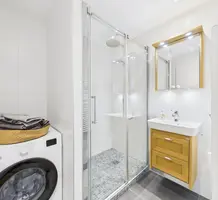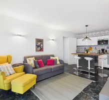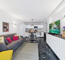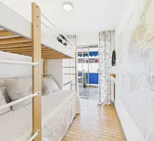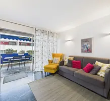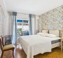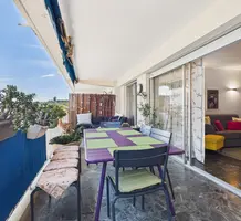 Квартира на пятом (предпоследнем) этаже здания с лифтом и консьержем в нескольких шагах от песчаного пляжа. Общая площадь 71 m² (жилая 50 m²) - холл с гардеробной, гостиная 21.3 m² с кухней и террасой 21 m² - есть небольшой проблеск моря, две спальни 7 и 11.5 m², душевая комната и отдельный туалет. Хорошее состояние, включён гараж и кладовая. Коммунальные платежи за квартал 538 €, годовой налог 995 €.
