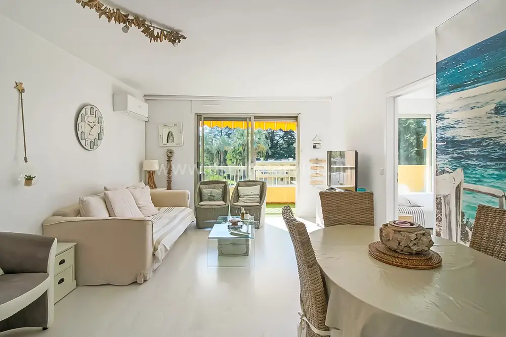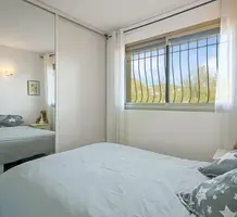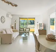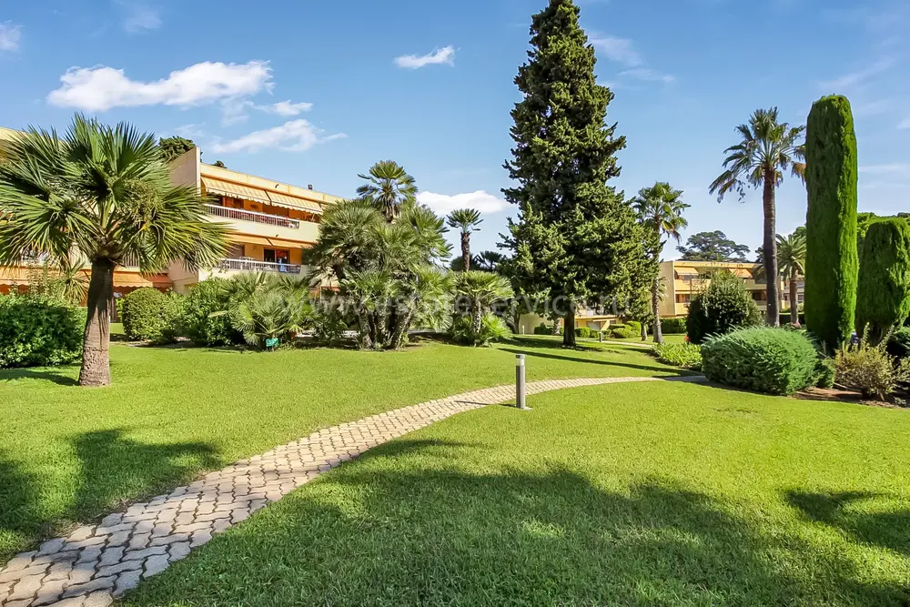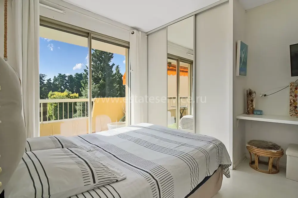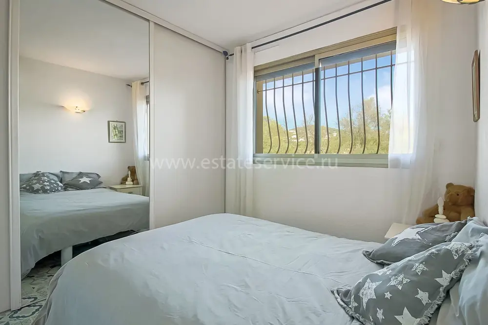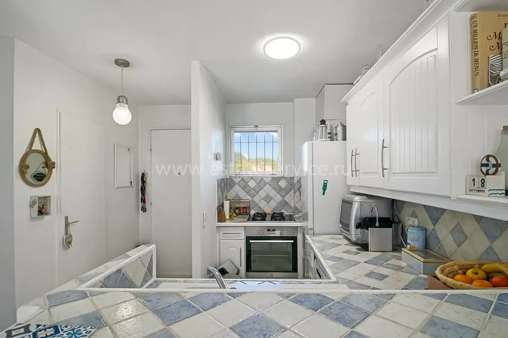 Апартаменты на верхнем (третьем) этаже о закрытого кондоминиума с двумя бассейнами, садом и пешей доступностью от пляжа. Площадь квартиры 60 m² - светлая гостиная 27 m² с кухней открытой планировки, две комфортабельные спальни 10 и 10 m², ванная комната, душевая, отдельный туалет и терраса 11 m² с приятным видом на зелень. Приличное состояние, включено частное парковочное место на территории. Коммунальные платежи 240 €, годовой налог 1.035 €.