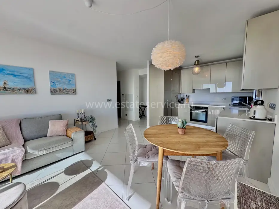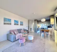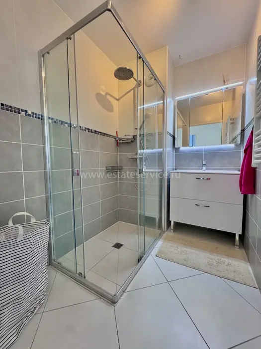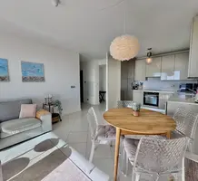 Апартаменты на пятом (предпоследнем) этаже современной резиденции с закрытой зелёной территорией и бассейном. Общая площадь 80.7 m² (жилая 62.2 m²) - прихожая, светлая гостиная 31 m² с встроенной кухней и крытой угловой террасой 18.5 m², две спальни, душевая комната и отдельный туалет. Отличное состояние, включён двойной закрытый гараж.