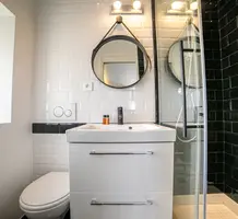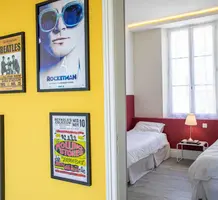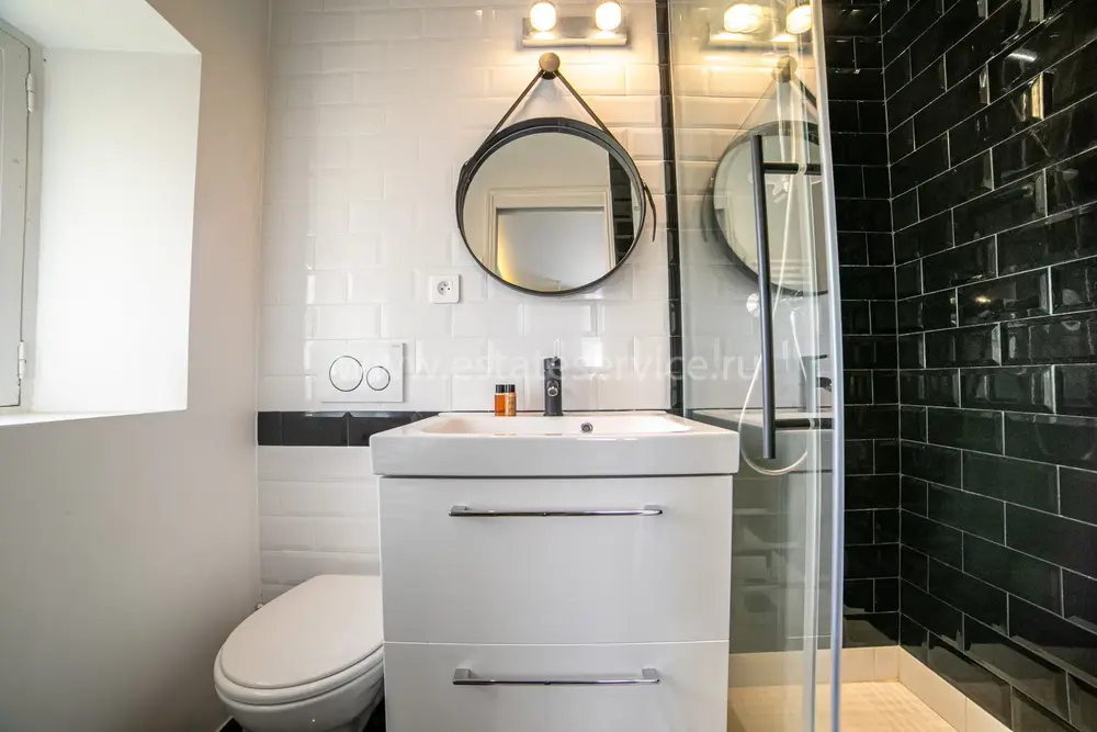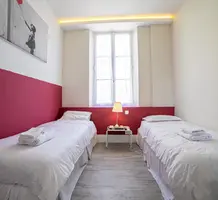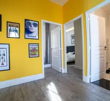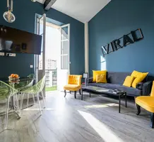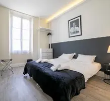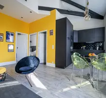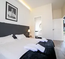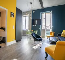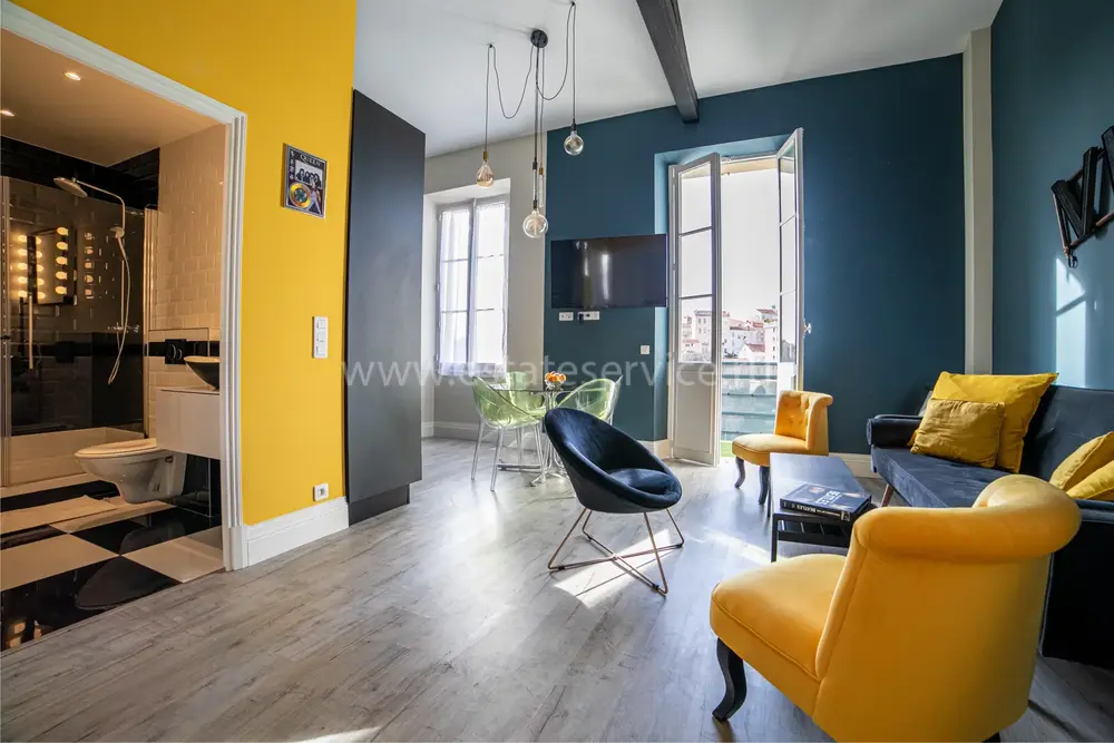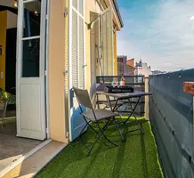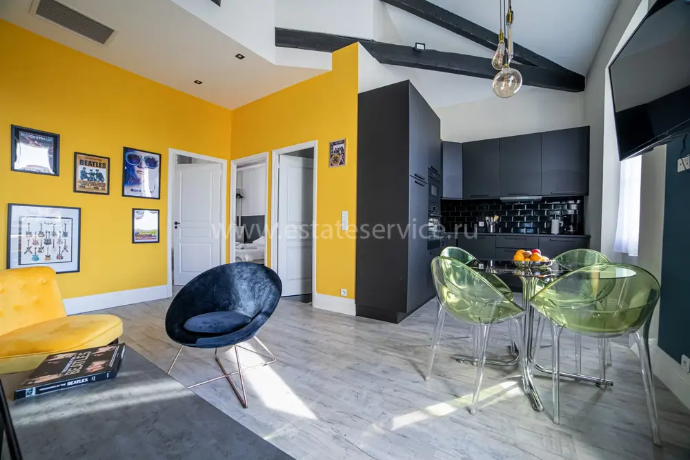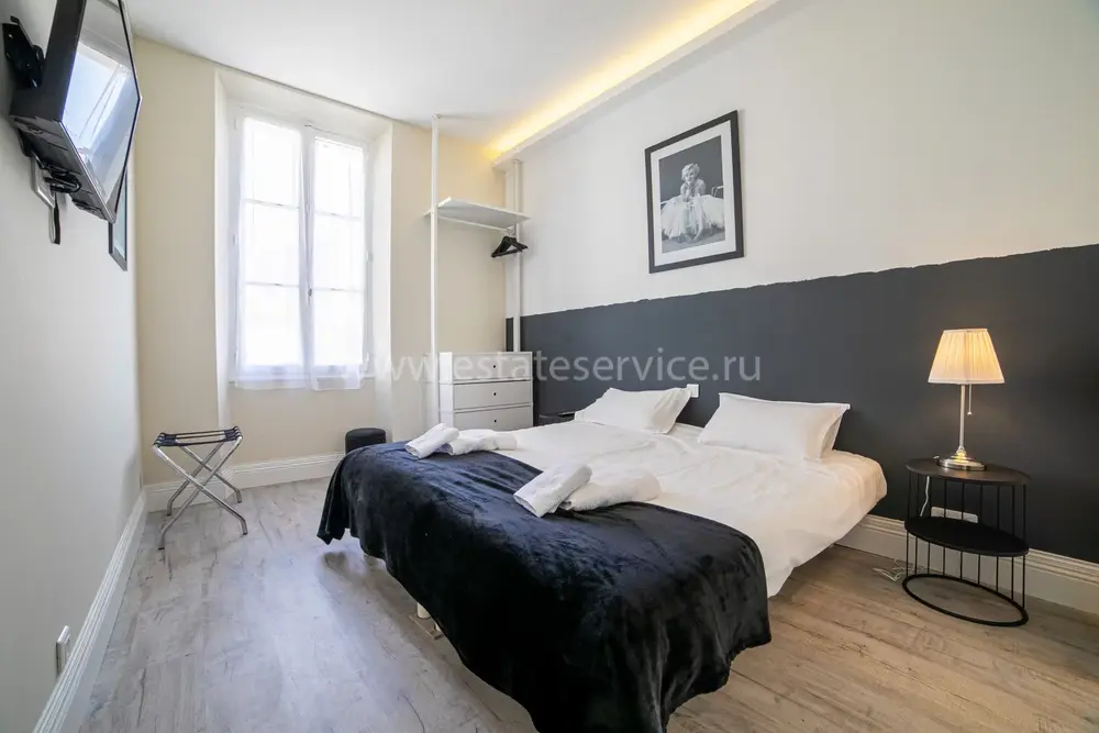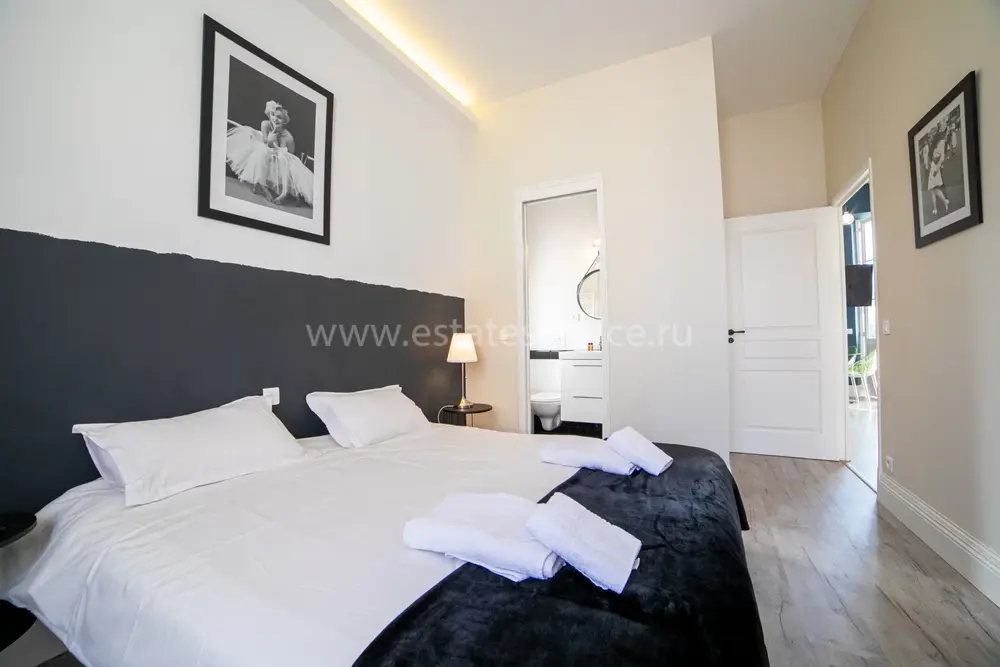 Стильные апартаменты на верхнем (3-м) этаже здания без лифта недалеко от центра Канн. Жилая площадь 55 m² состоит из гостиной 25 m² с открытой кухней и балконом 4.8 m², главной спальни 11.6 m² с душевой/туалетом, второй спальни 10.5 m² и общей ванной комнаты 3.5 m² с туалетом. Качественный ремонт и отделка, кондиционер, можно приобрести с мебелью. Коммунальные платежи 87 €, годовой налог 580 €.