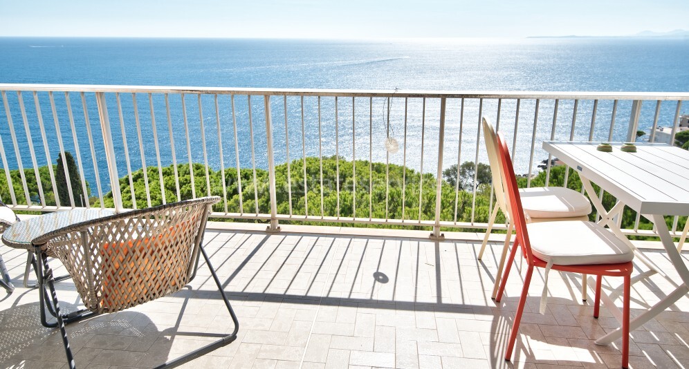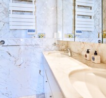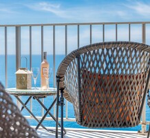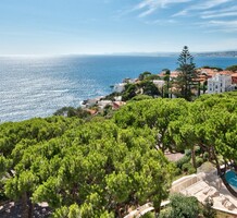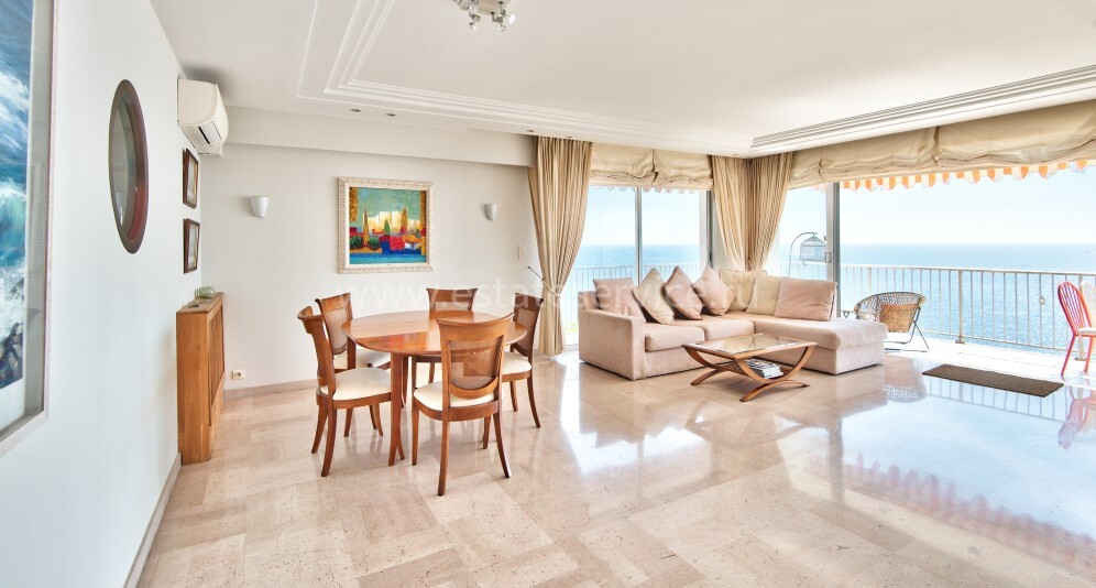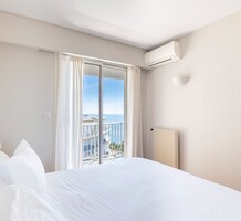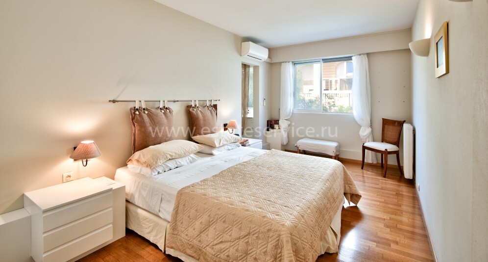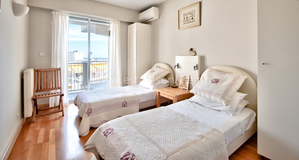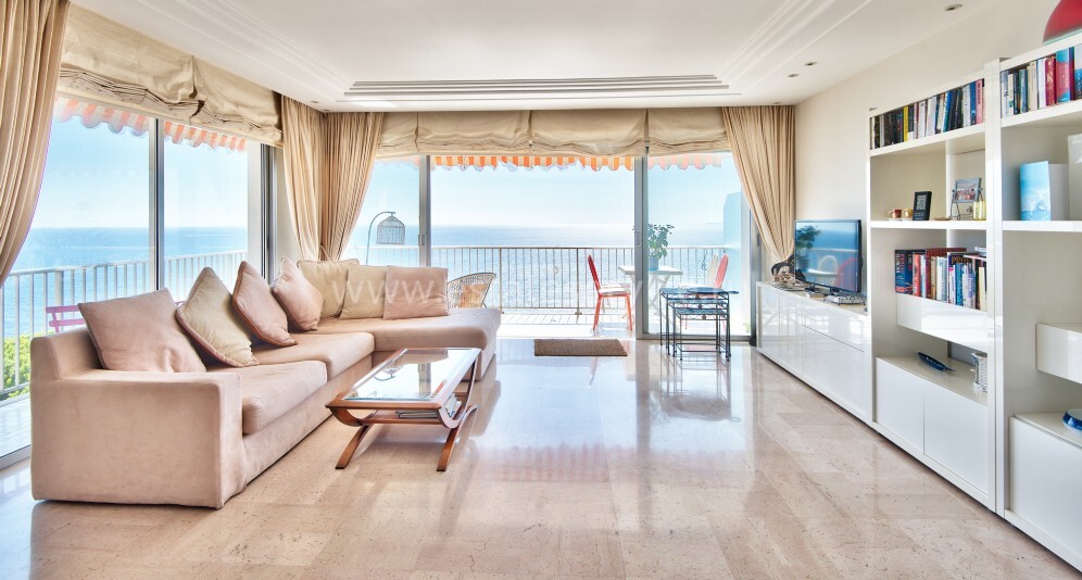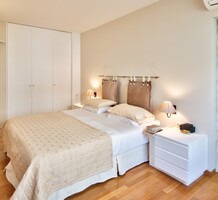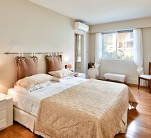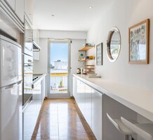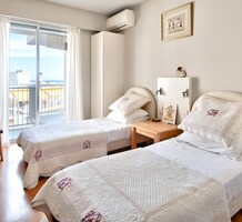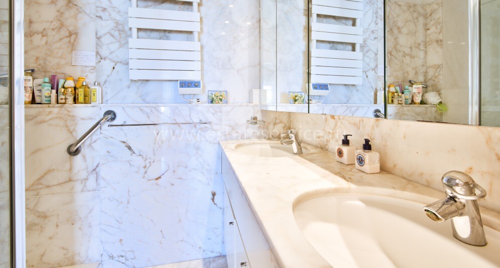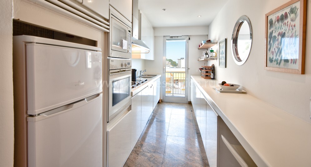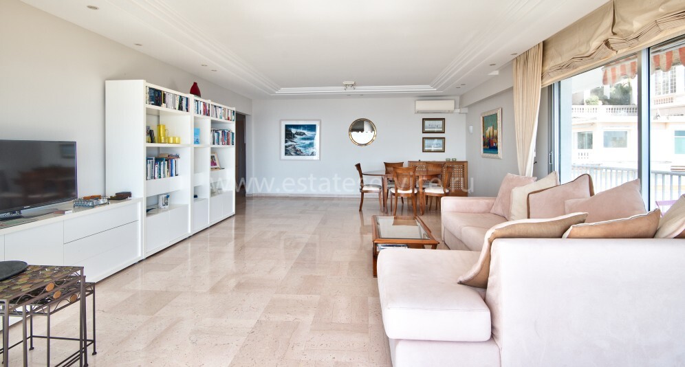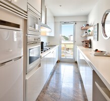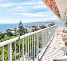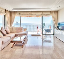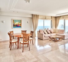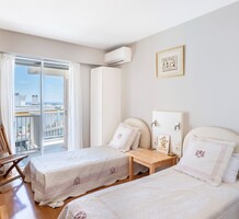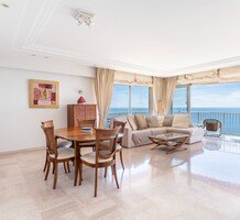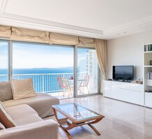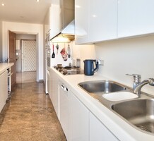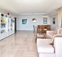 Светлая и просторная квартира на предпоследнем этаже кондоминиума с бассейном, консьержем, садом и парковкой. Общая площадь 116 m² (жилая 111 m²) - прихожая, двойная гостиная и отдельная кухня выходят на панорамную террасу 32 m², три спальни, одна со своей душевой и туалетом, общая душевая и отдельный санузел с раковиной. Включены кладовая, частный закрытый гараж и подсобная комната - можно использовать под прачечную, гардеробную или детскую. Коммунальные платежи 523 €, годовой налог 2.829 €.