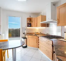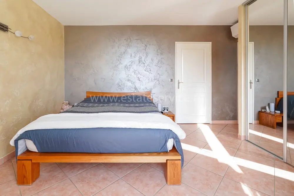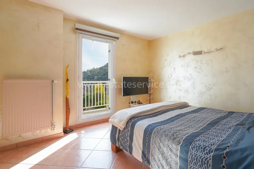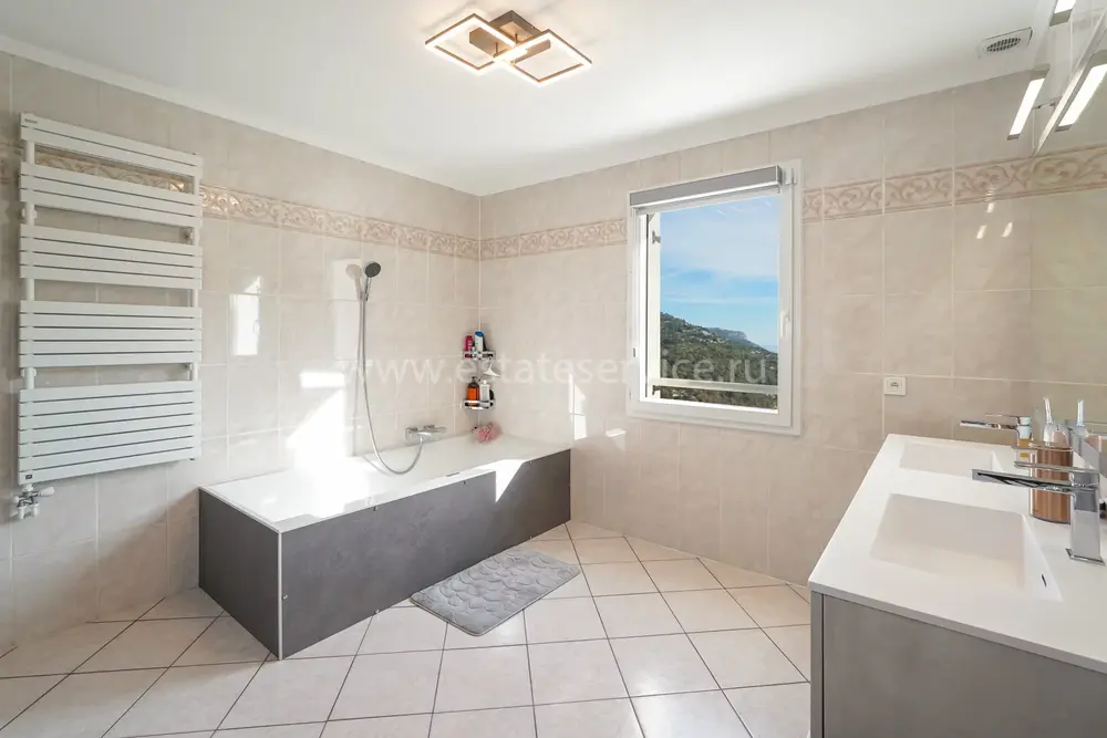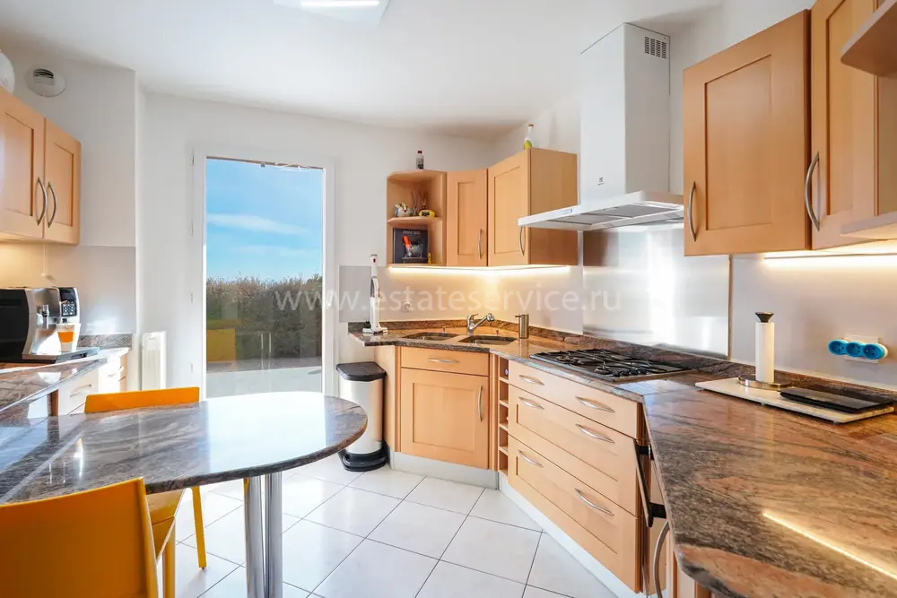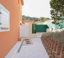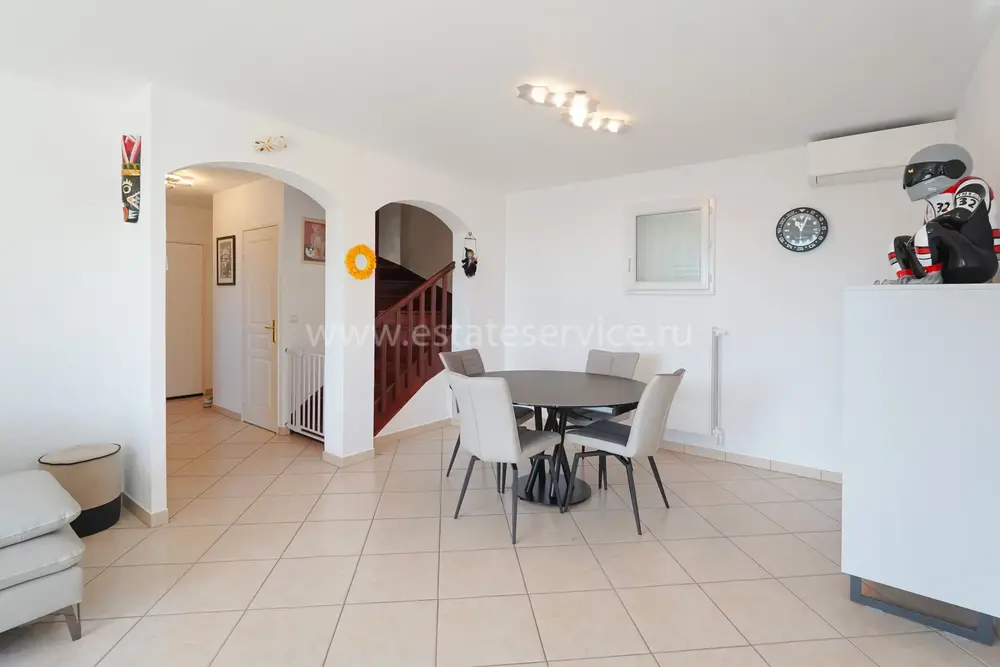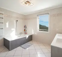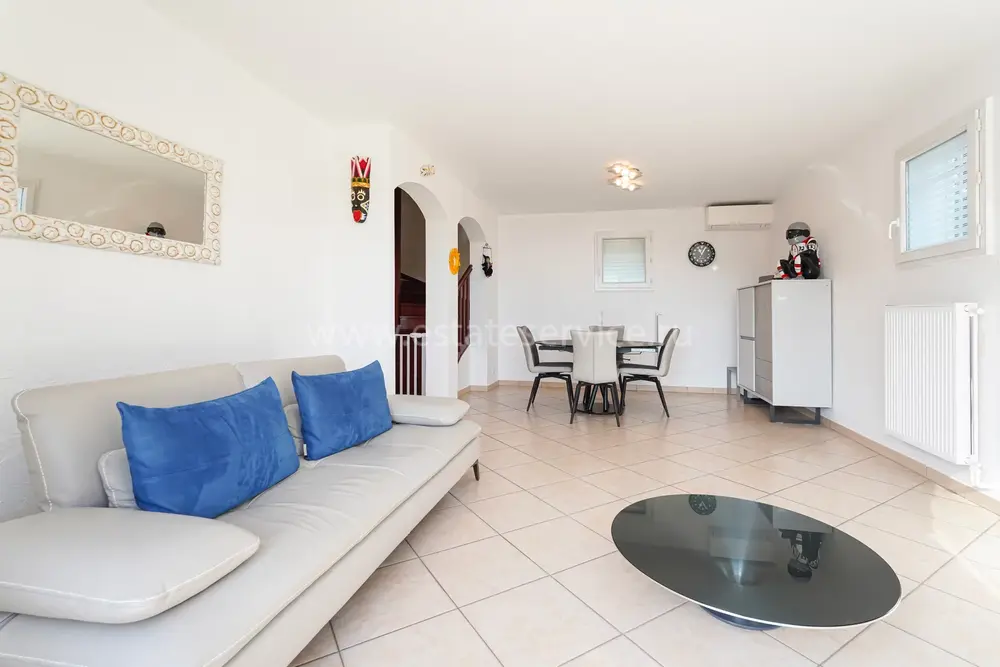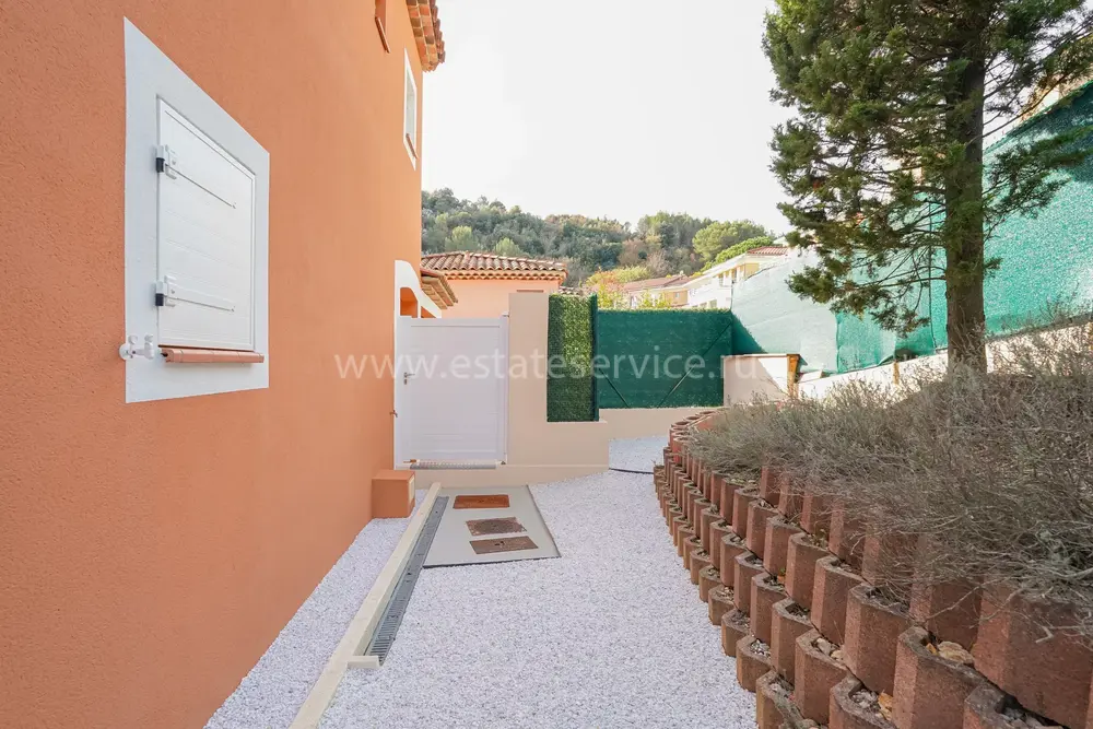 Тихая современная вилла в закрытом безопасном кондоминиуме с ухоженной территорией и общим бассейном. Жилая площадь 86 m² + гараж с автоматическими воротами и мезонином для хранения вещей и подвал. На первом уровне - светлая гостиная с выходом на террасу 20 m² и в сад, отдельная кухня и гостевой туалет, наверху - главная спальня с собственной ванной и балконом - шикарный вид на море и горы, вторая спальня с большой гардеробной, общая душевая комната и отдельный туалет. Отличное состояние, терминал для электромобилей, электрические жалюзи, супермаркет и все удобства рядом, готов к заселению! Коммунальные платежи 115 €, годовой налог 1.546 €.