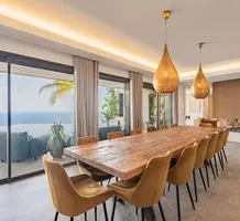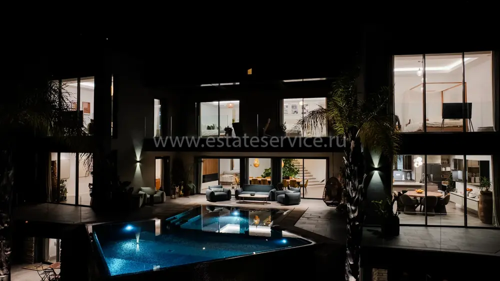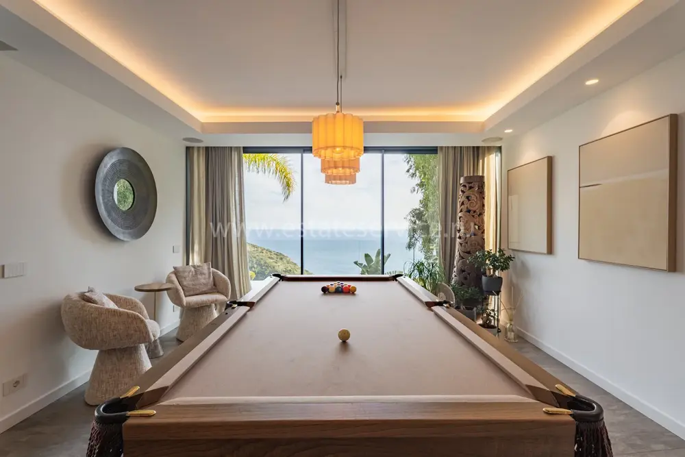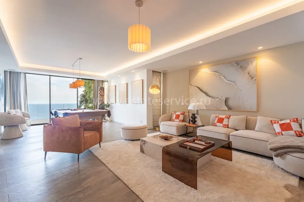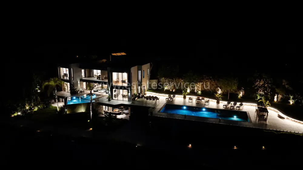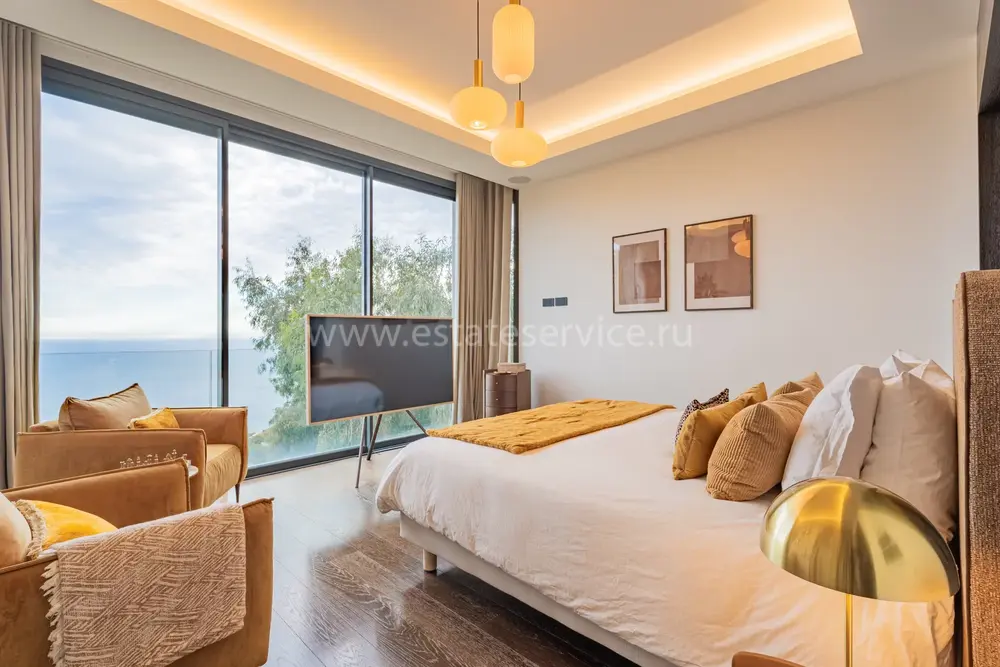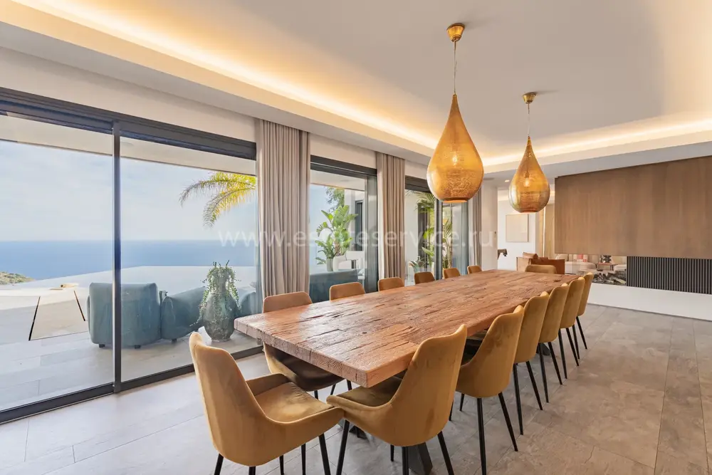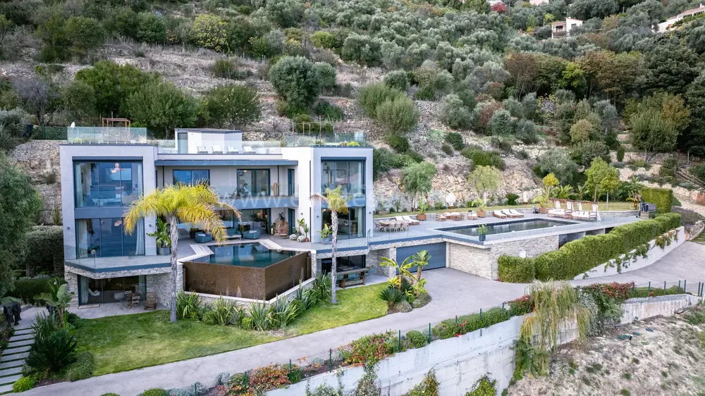 Современная вилла с невероятным морским видом и удобным расположением в престижном закрытом домене. Общая площадь 554 m² (жилая 484 m²) - тройная гостиная с бильярдной и столовой зонами, открытой островной кухней и выходом на террасу, пять больших спален с ванными комнатами, тренажерный зал, бар/дискотека, два бассейна, большой гараж, множество террас и подсобных помещений. Идеальное состояние, ухоженный сад, внутренний лифт и прочие удобства.