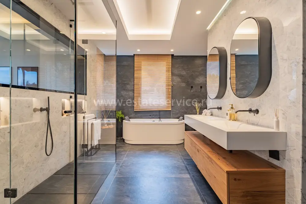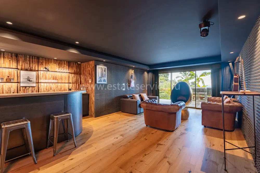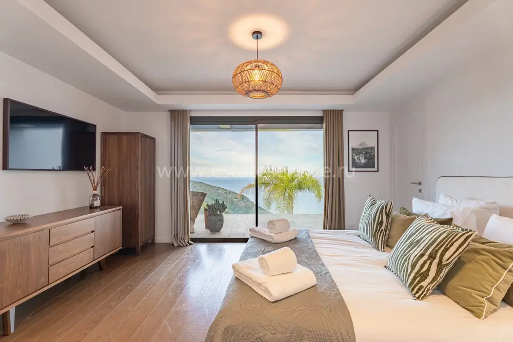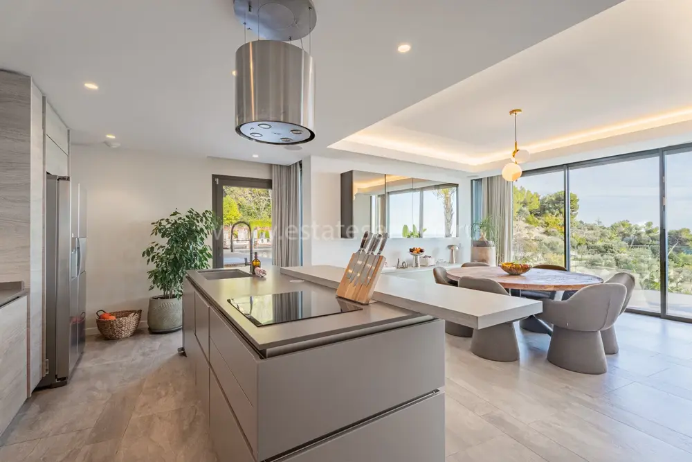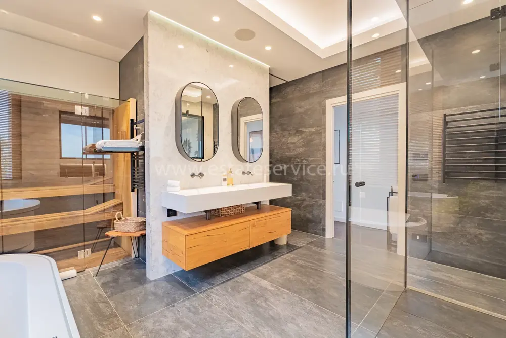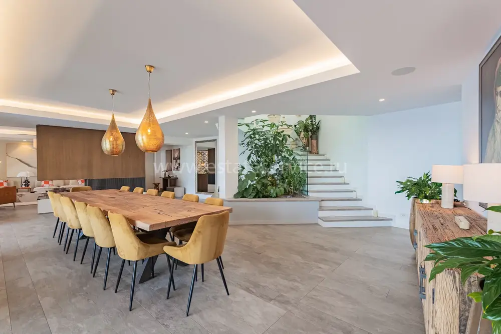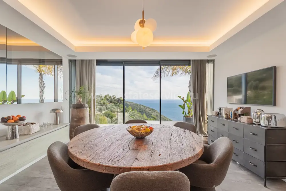 Современная вилла с невероятным морским видом и удобным расположением в престижном закрытом домене. Общая площадь 554 m² (жилая 484 m²) - тройная гостиная с бильярдной и столовой зонами, открытой островной кухней и выходом на террасу, пять больших спален с ванными комнатами, тренажерный зал, бар/дискотека, два бассейна, большой гараж, множество террас и подсобных помещений. Идеальное состояние, ухоженный сад, внутренний лифт и прочие удобства.
