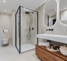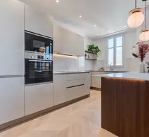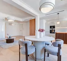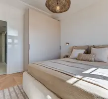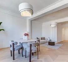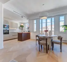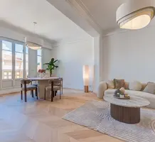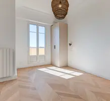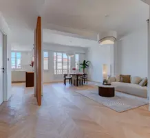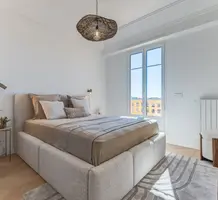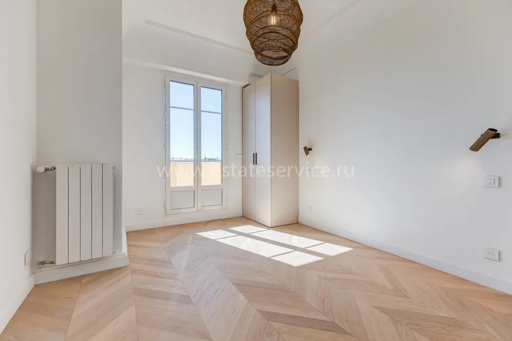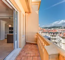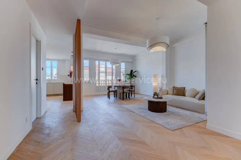 Квартира с новым ремонтом на верхнем (7-м) этаже здания Art Déco с лифтом в центре Ниццы. Жилая площадь 88 m² + балконы: двойная гостиная-столовая с открытой островной кухней, две тихие спальни с душевым комнатами и отдельный туалет. Шикарная отделка, высокие потолки, кондиционер, продаётся с мебелью. Коммунальные платежи 330 €.