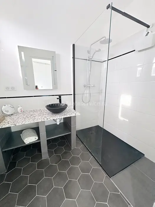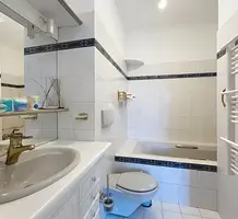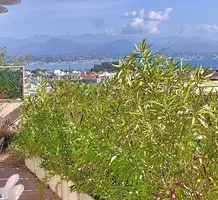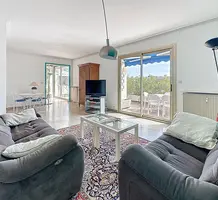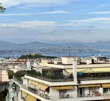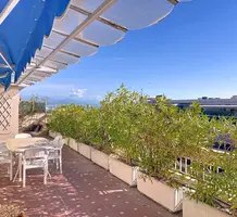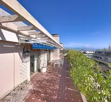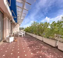 Светлая и просторная квартира на верхнем (8-м) этаже ухоженного здания с лифтом возле всей инфраструктуры. Общая площадь 108 m² (жилая 93.6 m²) - прихожая, двойная гостиная 29 m² с верандой 15 m² и выходом на большую террасу 54 m², отдельная кухня 17 m², две спальни по 12 m², одна выходит на террасу, вторая с собственным балконом 11 m², ванная подвесным туалетом, душевая комната и отдельный санузел. Хорошее состояние, включён гараж, кондиционер. Коммунальные платежи 385 €, годовой налог 1.626 €.