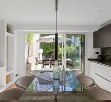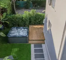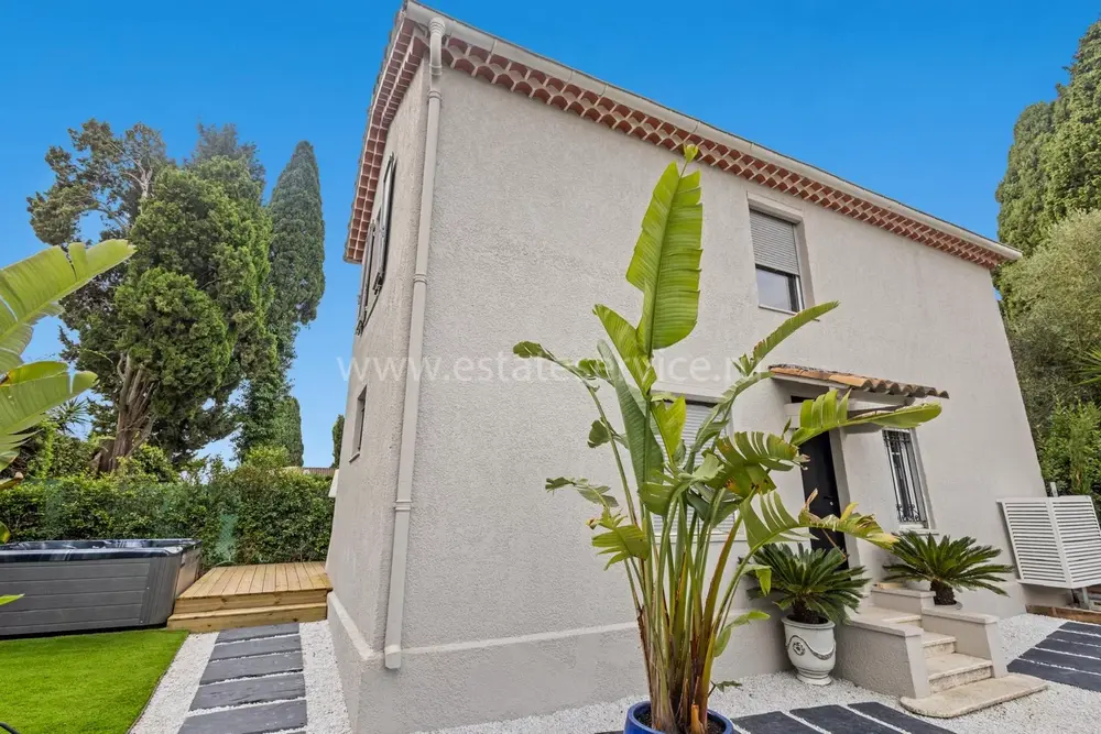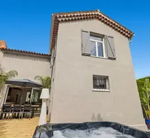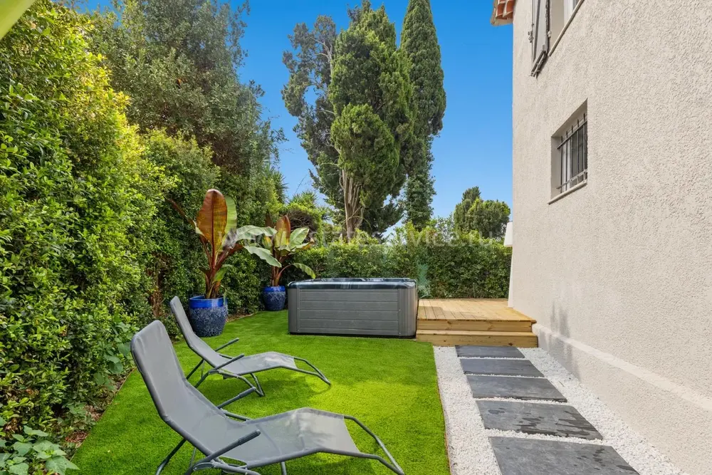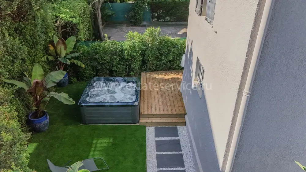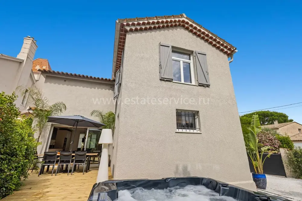 Уютный меблированный таунхаус с изысканной отделкой в закрытом комплексе в километре от моря. Жилая площадь 132 m², ровный участок с ландшафтным садиком 205 m² с газоном, джакузи на 8 человек и парковкой на 4-5 машин. На первом уровне двойная гостиная 26.7 m², кухня-столовая 21.6 m² с выходом на террасу, спальня-сьют 17.6 m² и отдельный санузел. Наверху разместились ещё один сьют 23.9 m², две спальни 13 и 15 m², душевая и два туалета. Ежемесячные платежи 130 €.