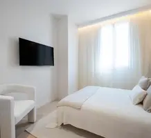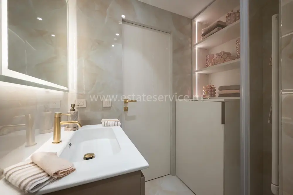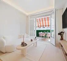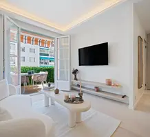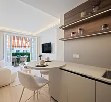 Апартаменты с ремонтом и мебелью на пятом (5/8) этаже престижной резиденции с лифтом и консьержем. Общая площадь квартиры 44 m² (жилая 36 m²) - прихожая, гостиная с открытой кухней и террасой 8 m² - боковой вид на море, могут разместиться 4-6 человек, тихая спальня с гардеробной, изготовленной под заказ, душевая комната и санузел с подвесным туалетом. Качественные материалы, дубовый паркет, реверсивный кондиционер. Коммунальные платежи 190 €, годовой налог 1.214 €.