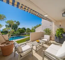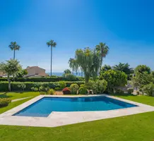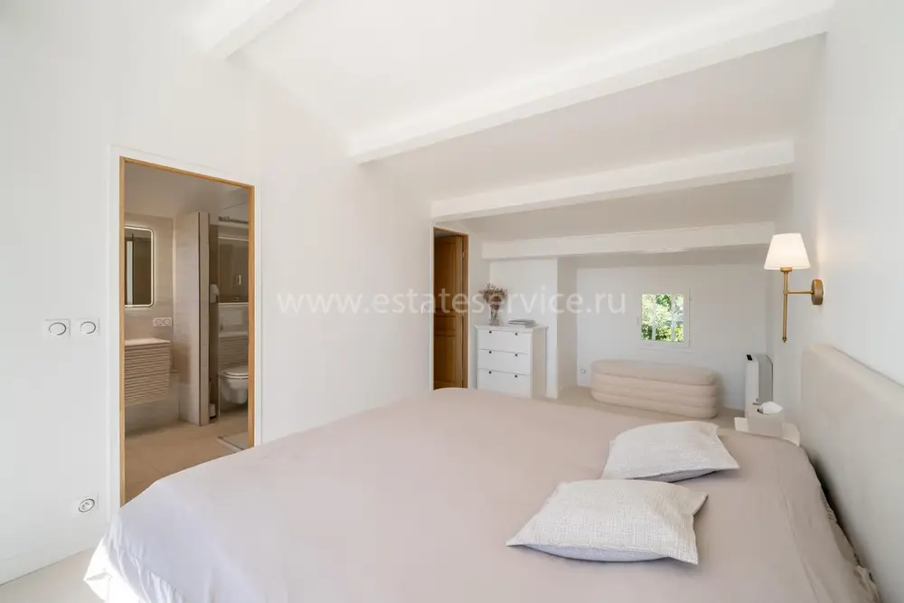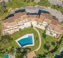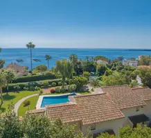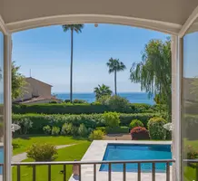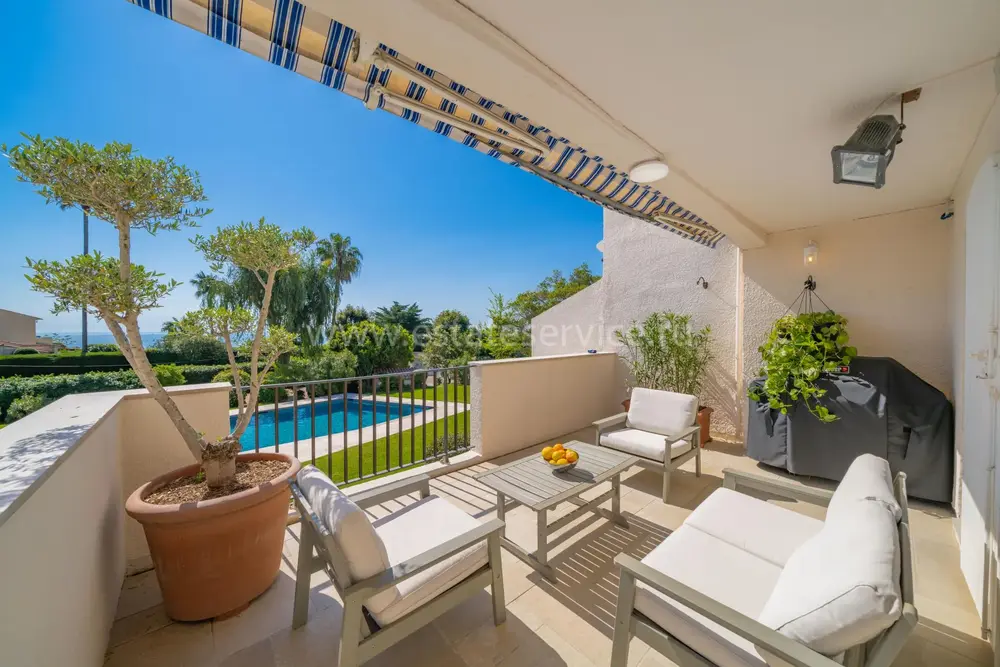 Смежный дом в закрытом поместье (всего из 4 вилл) с парком и бассейном в 150-ти метрах от моря. Общая площадь 264 m² (жилая 183 m²) - светлая и просторная гостиная с примыкающей кухней и выходом на террасу, на уровне сада разместились три спальни (одна с душевой) с общей затененной террасой, наверху - главная спальня 25 m² с ванной комнатой, гардеробной и собственной террасой Отличное состояние, есть также прачечная и закрытый гараж 25 m², всё пешком. Коммунальные платежи 700 €, годовой налог 2.500 €.