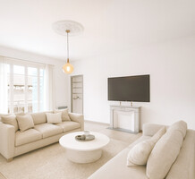 Обновлённый пентхаус (верхний этаж) на пешеходной улице в ста метрах от моря и музея Jean Cocteau Museum. Площадь квартиры 135 m² - прихожая, просторная гостиная с балконом, большая отдельная кухня, три спальни, стильная душевая комната, отдельный туалет и шикарная терраса для летних завтраков. Третий этаж здания без лифта, высокие потолки, камины, всё пешком. Фото 3D-визуализации представлены для наглядности.
