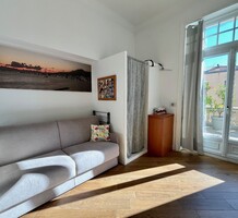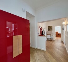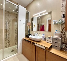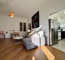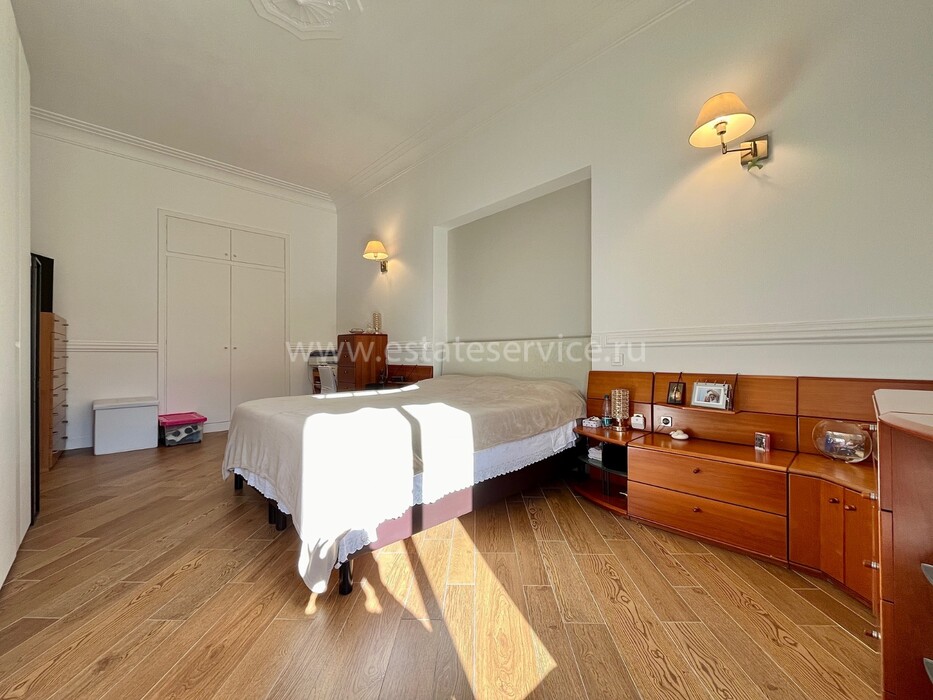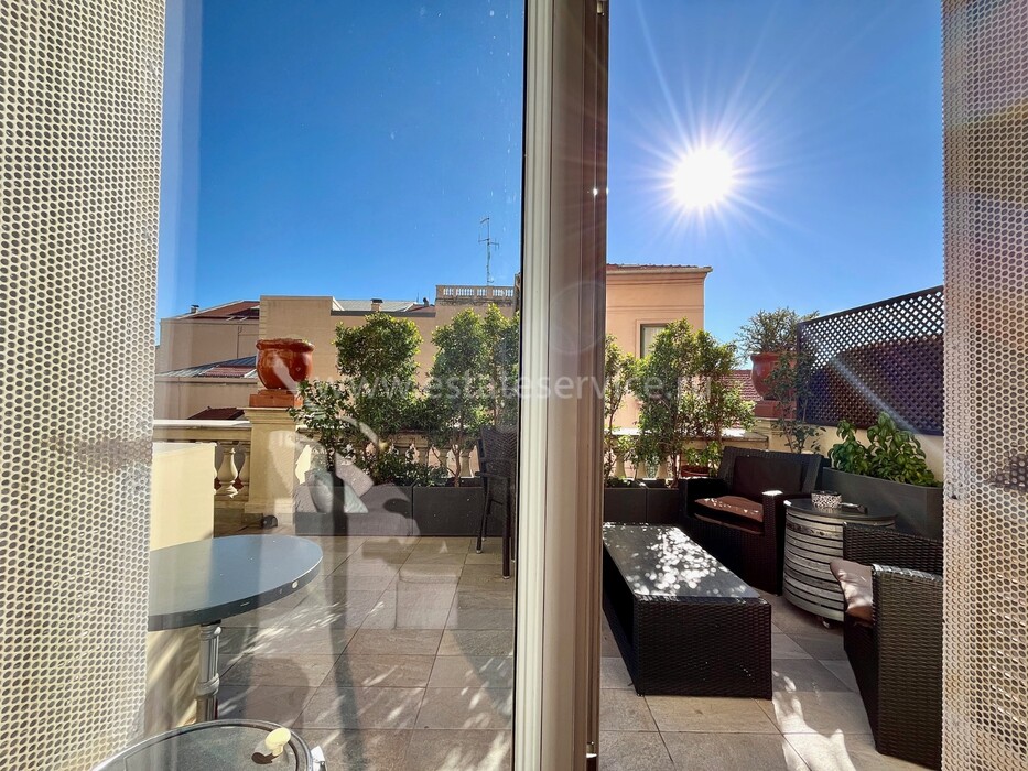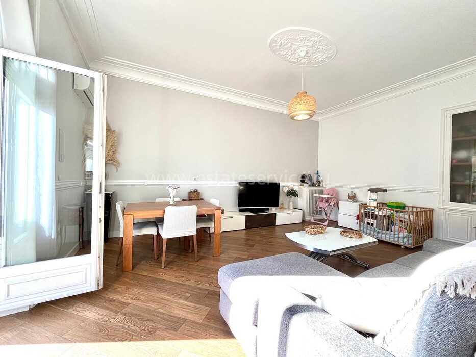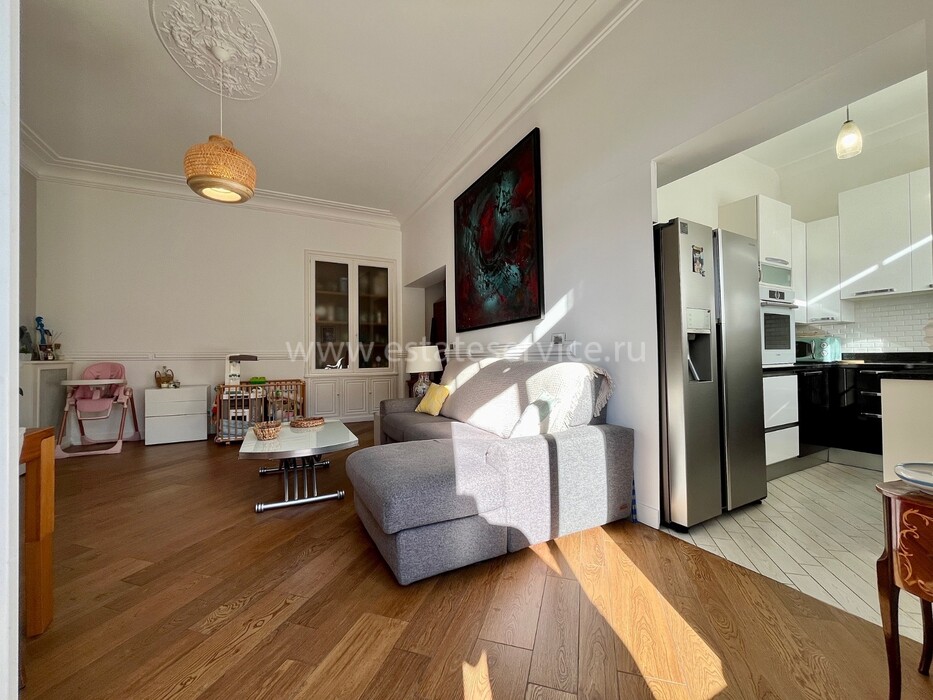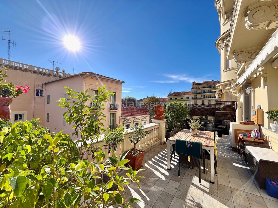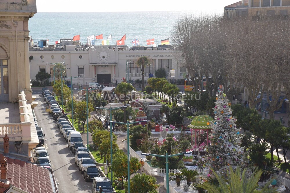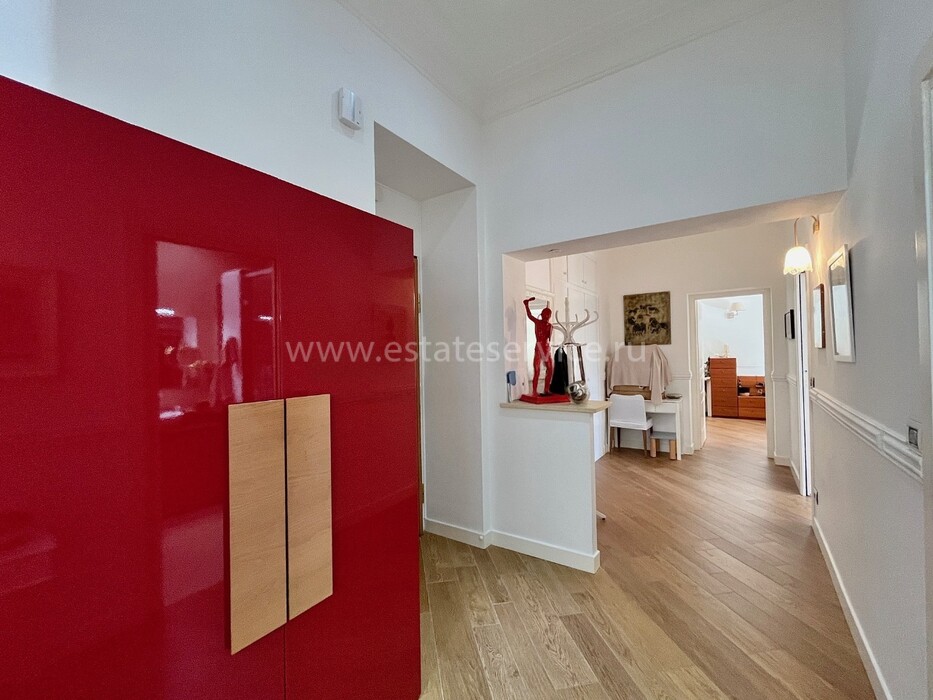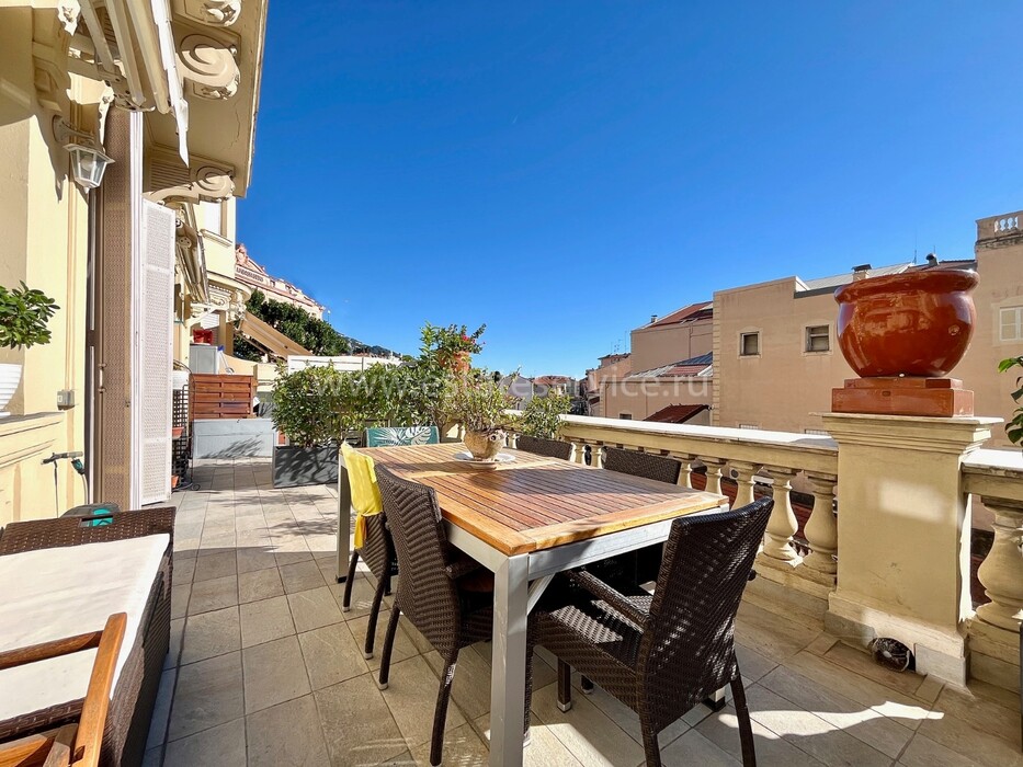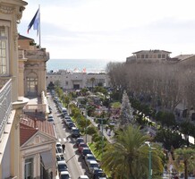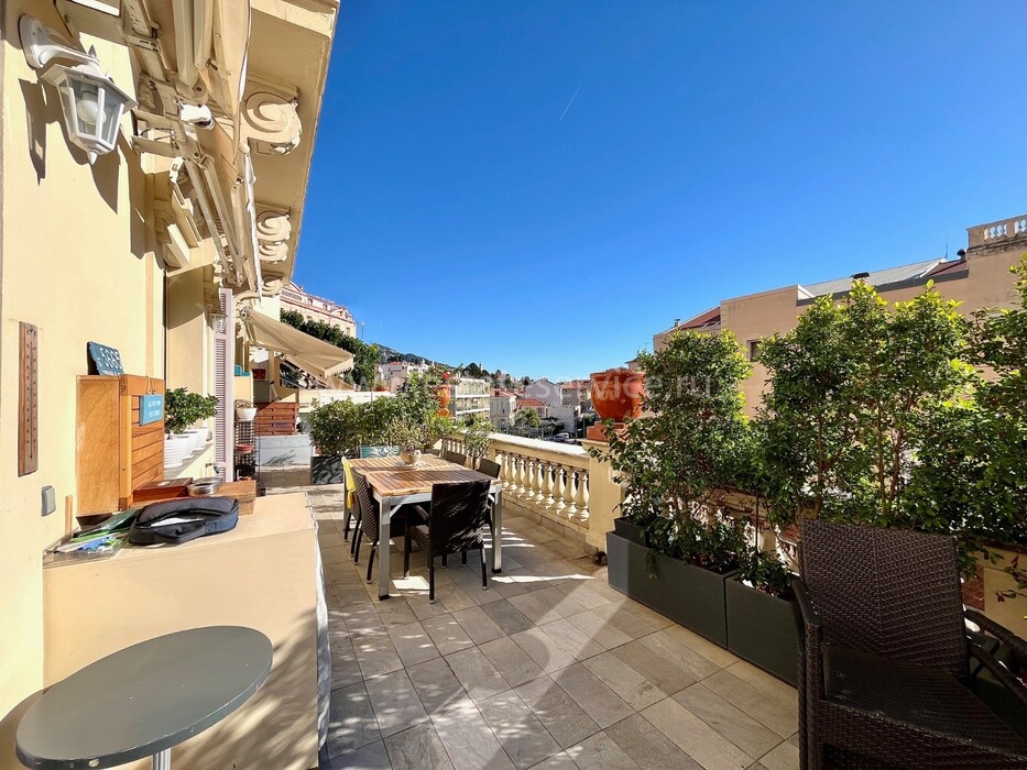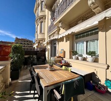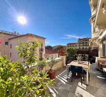 Светлая квартира с элегантным ремонтом в одном из самых красивых дворцов belle époque Ментона. Общая площадь 135.6 m² (жилая 87 m²) - широкий холл с гардеробной, гостиная 27.4 m² с примыкающей кухней, две спальни 13.5 и 22 m², одна с умывальником, вторая с встроенным шкафом - все комнаты выходят на шикарную террасу 49.3 m², общая душевая комната и туалет. Третий этаж здания с лифтом и консьержем, качественная отделка, высокие потолки, включена кладовая 4 m². Коммунальные платежи 380 €, годовой налог 1.784 €.