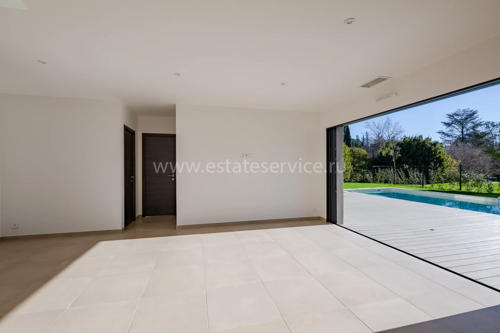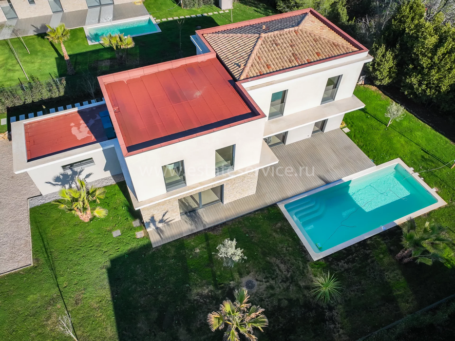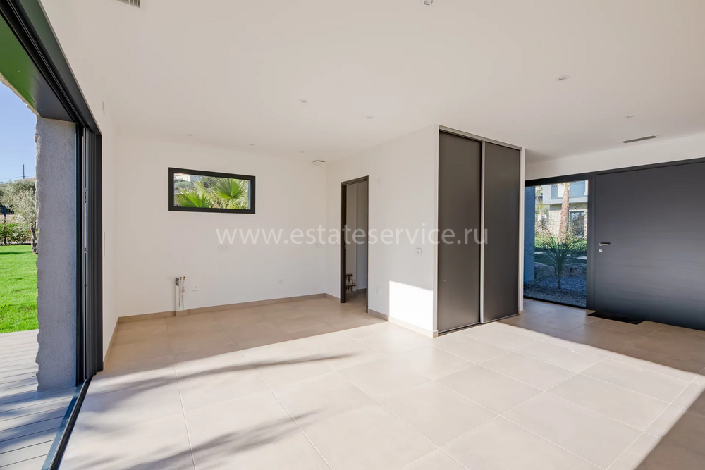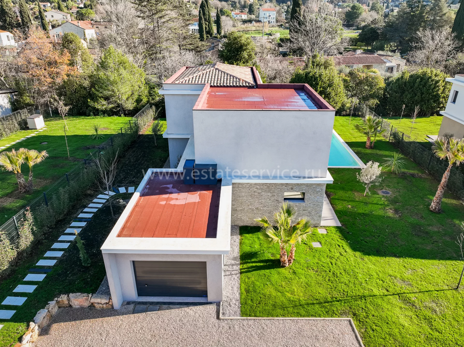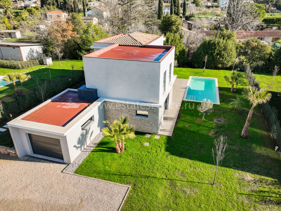Современная вилла с удобным расположением в пяти километрах от Mougins School, Канн и моря. Жилая площадь дома 189 m² + гараж 50 m², ровный участок 1.229 m² с ландшафтным садом, газоном, бассейном и паркингом. На первом уровне большая гостиная-столовая с открытой (не установлена) кухней, кладовая, спальня с ванной комнатой, туалетом и закрытый гараж. Наверху разместились ещё три спальни, три ванные/душевые и прачечная. Качественные материалы и отделка, близость магазинов и основных удобств, готова к заселению!