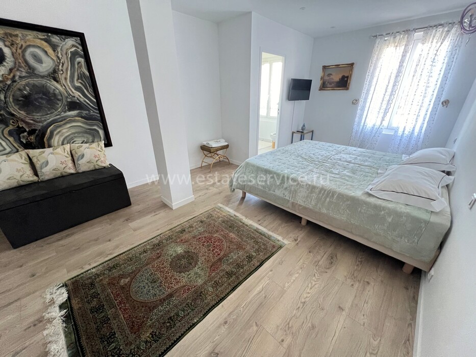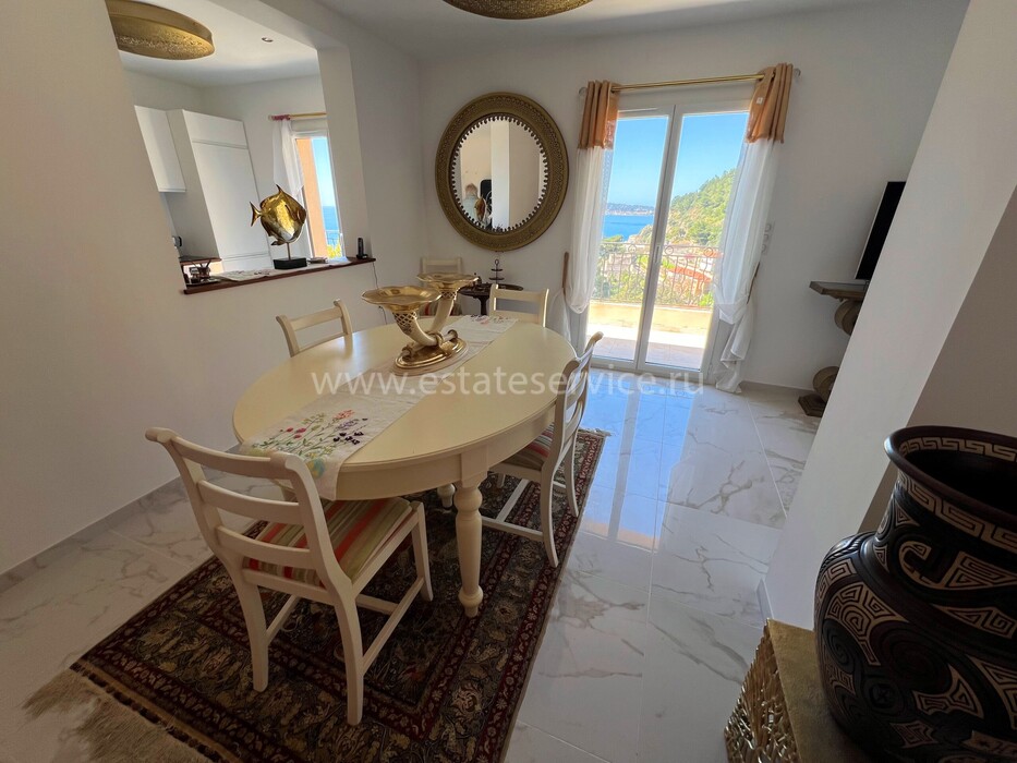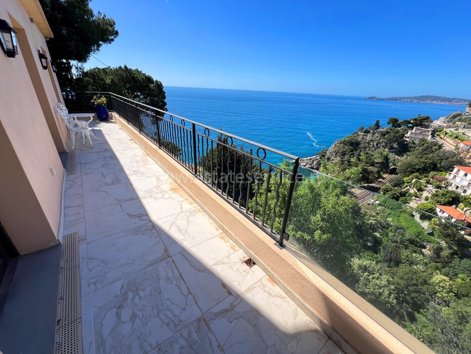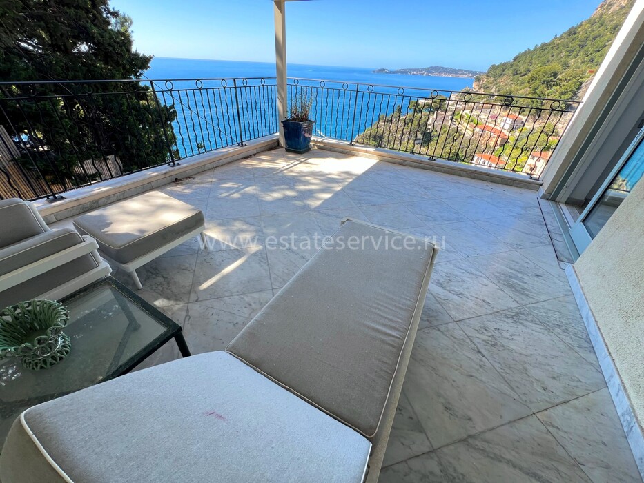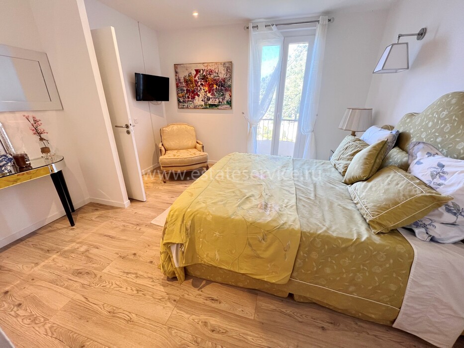 Ухоженная вилла с захватывающей панорамой на море и Кап-Ферра. Жилая площадь 400 m² + гараж 25 m², участок земли 5.000 m². Дом имеет два отдельных входа, в настоящее время разделён (легко объединить) на 4 независимых (каждый со своей кухней) апартамента. В целом на трёх уровнях разместились три гостиные, шесть спален, шесть ванных/душевых, кабинет, большой подвал, гараж и террасы. Хорошее состояние, есть место под бассейн, семь парковочных мест, пешая доступность моря, основных удобств и центра Кап-д'Ай.