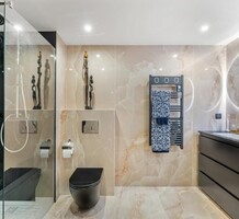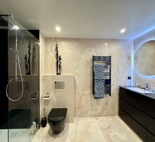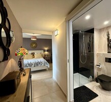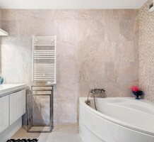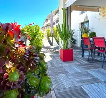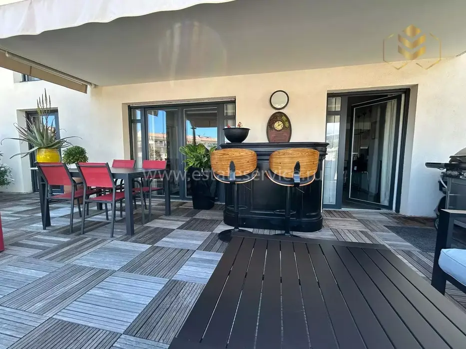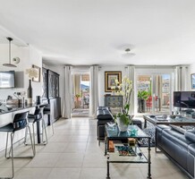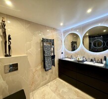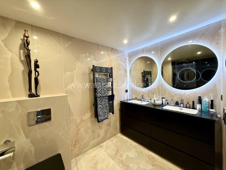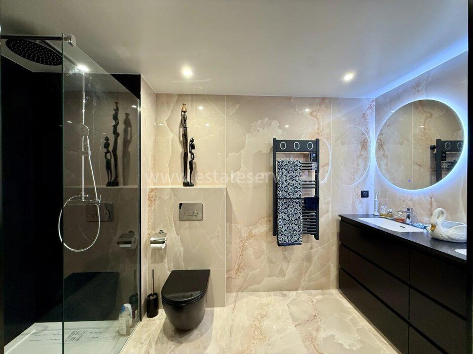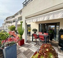 Четырёхкомнатные апартаменты на шестом (предпоследнем) этаже современного здания в 300-х метрах от моря. Общая площадь 172 m² (жилая 110 m² + три террасы) - прихожая, тройная гостиная 41 m² с островной кухней и выходом на две террасы 12 и 45 m² с зоной барбекю, главная спальня 20.6 m² с душевой, гардеробной и балконом 7 m², ещё две спальни 13.8 и 14 m², ванная комната с гидромассажной ванной и санузел. Отличное состояние, установлены солнечные батареи, включены кладовая и гараж 12.6 m², можно докупить крытый паркинг. Коммунальные платежи 330 €.