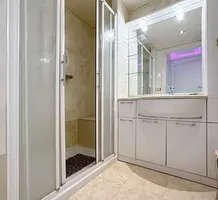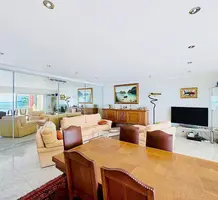 Просторная квартира на пятом (предпоследнем) этаже здания в престижном секторе Палм Бич. Общая площадь 155.9 m² (жилая 118 m²) - прихожая 10 m², светлая гостиная 36.3 m² и отдельная кухня 12.2 m² выходят на большую террасу 28 m², три большие спальни 11.5, 16.6 и 18.4 m² с верандами 3.2 и 6.7 m², главная спальня со своей ванной комнатой, туалетом и гардеробной, общая душевая и туалет. Квартира занимает весь этаж, включены два закрытых гаража 13.9 и 28.1 m² и кладовая. Годовой налог на недвижимость 2.563 €.